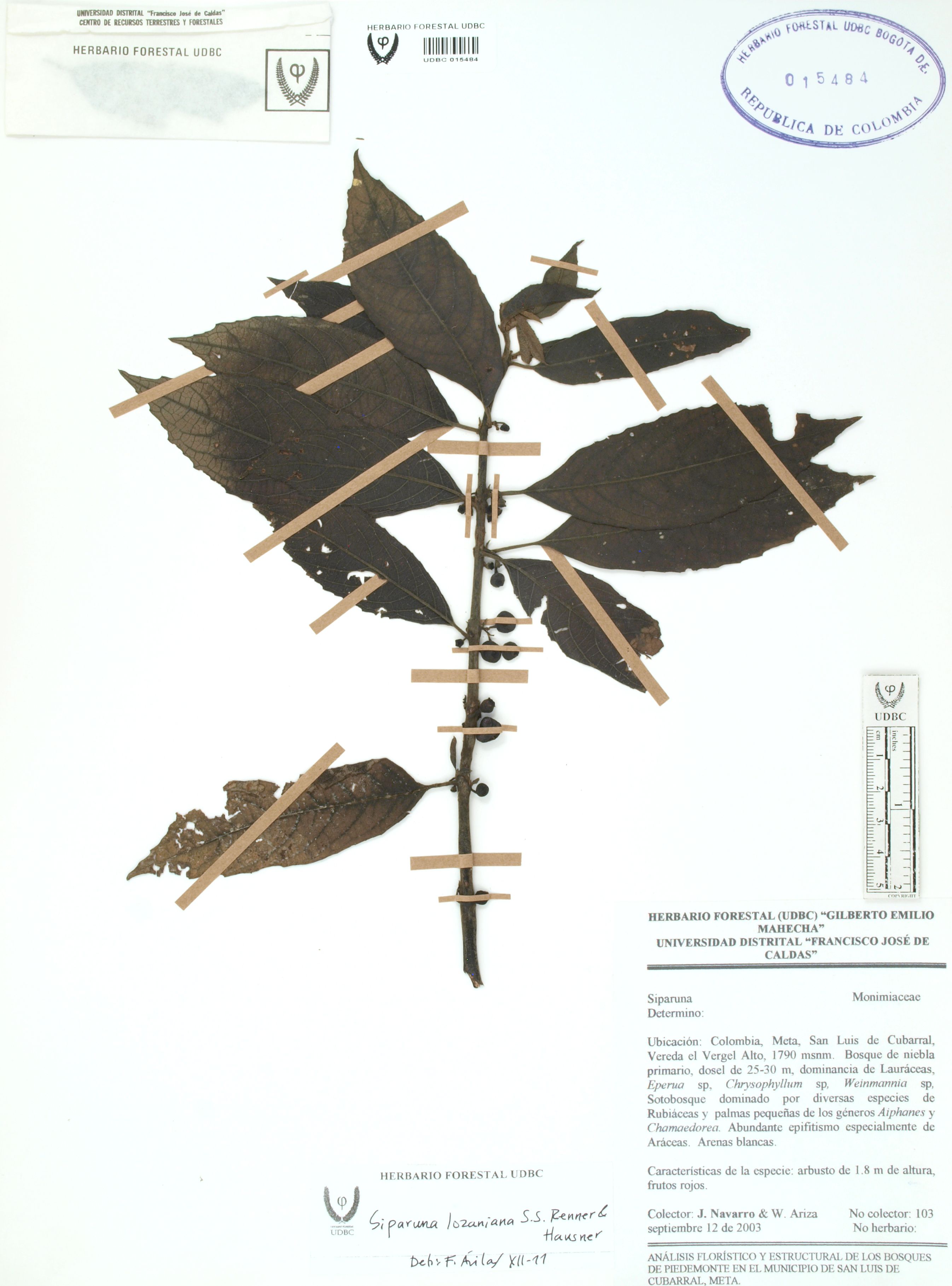 Fotografía del ejemplar Navarro, J. 103, determinado como Siparuna lozaniana en el año 2011
