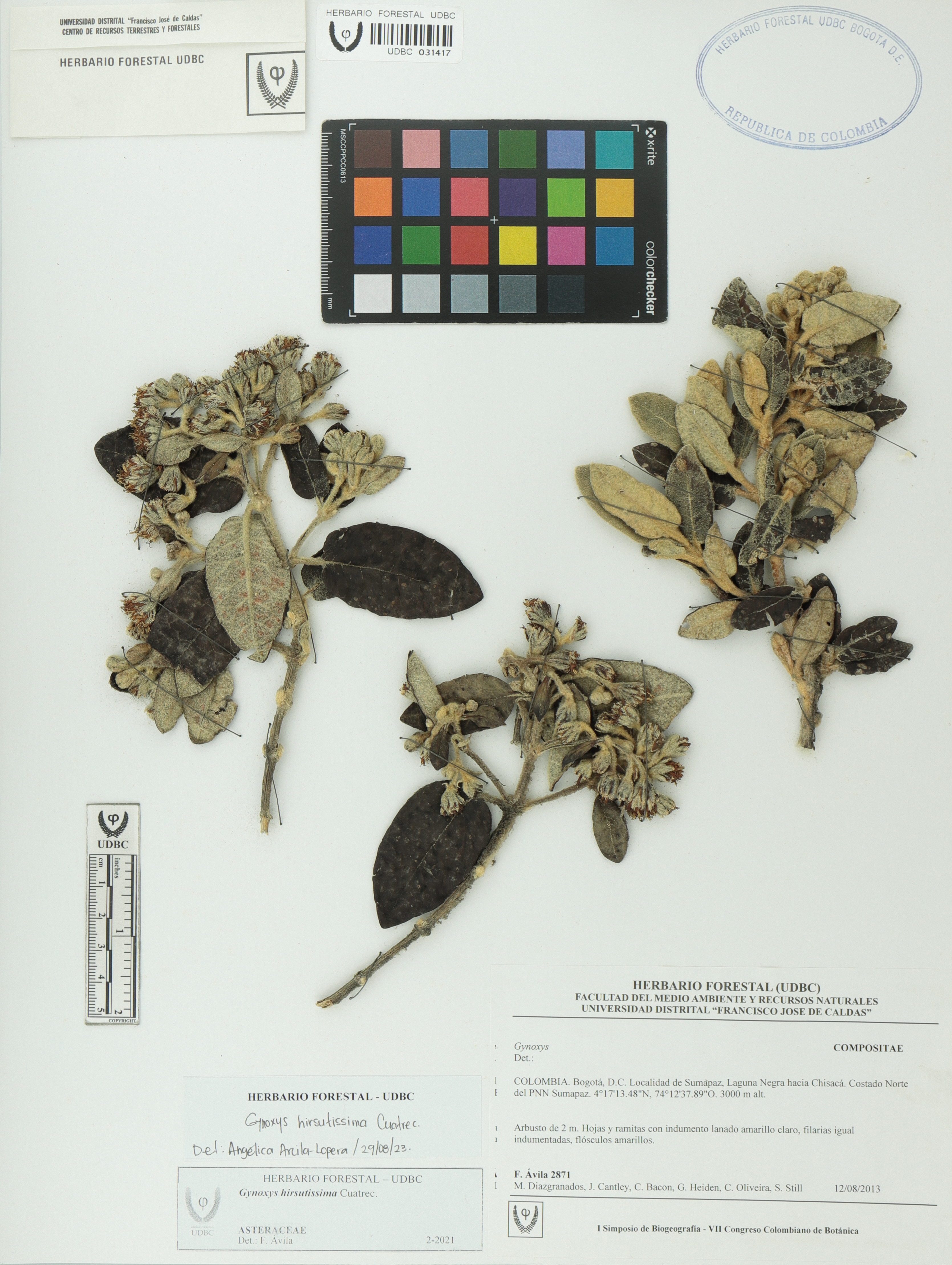 Fotografía del ejemplar Ávila, F. 2871, determinado como Gynoxys hirsutissima en el año 2021