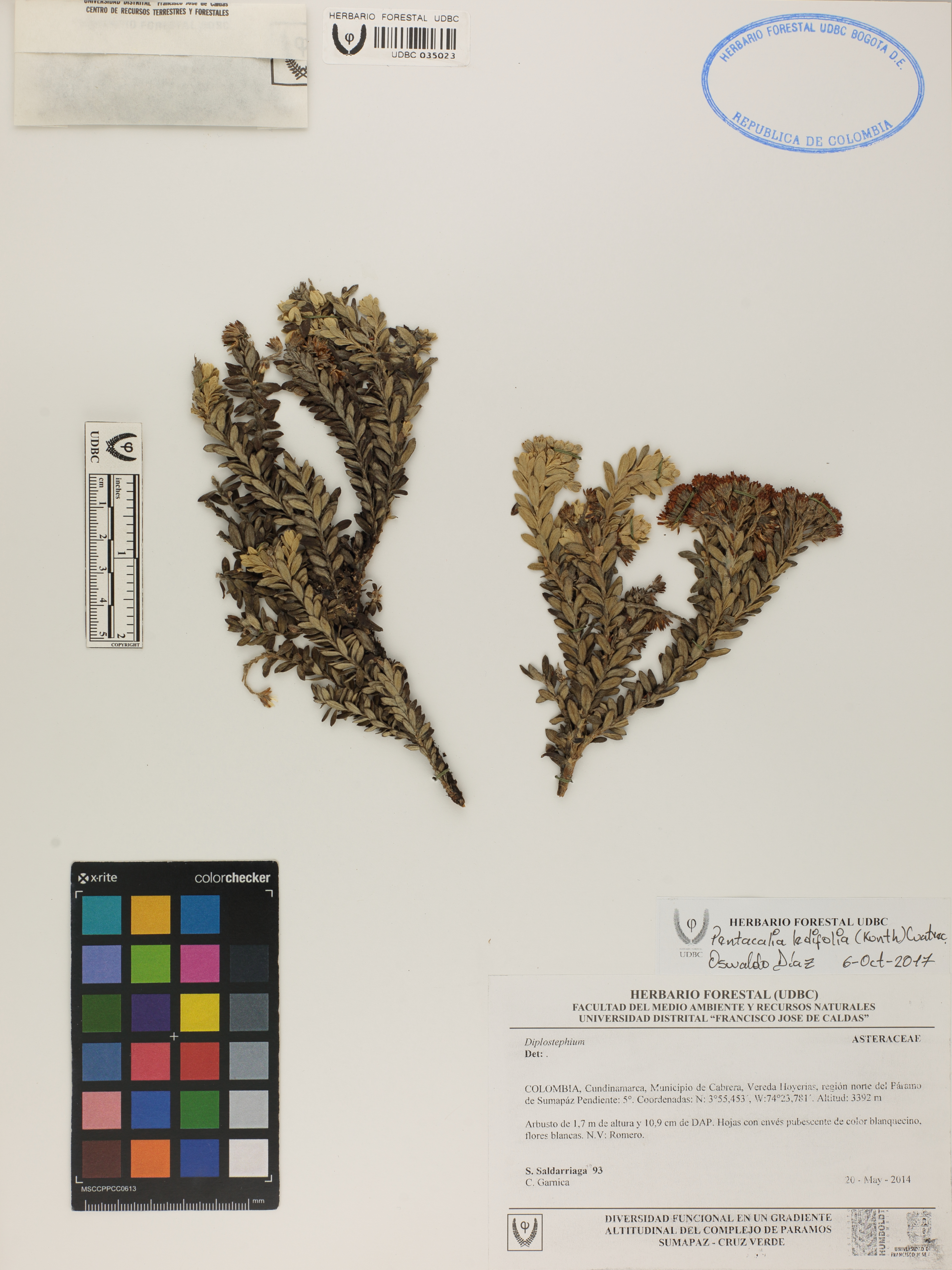 Fotografía del ejemplar Saldarriaga, S. 93, determinado como Pentacalia ledifolia en el año 2017