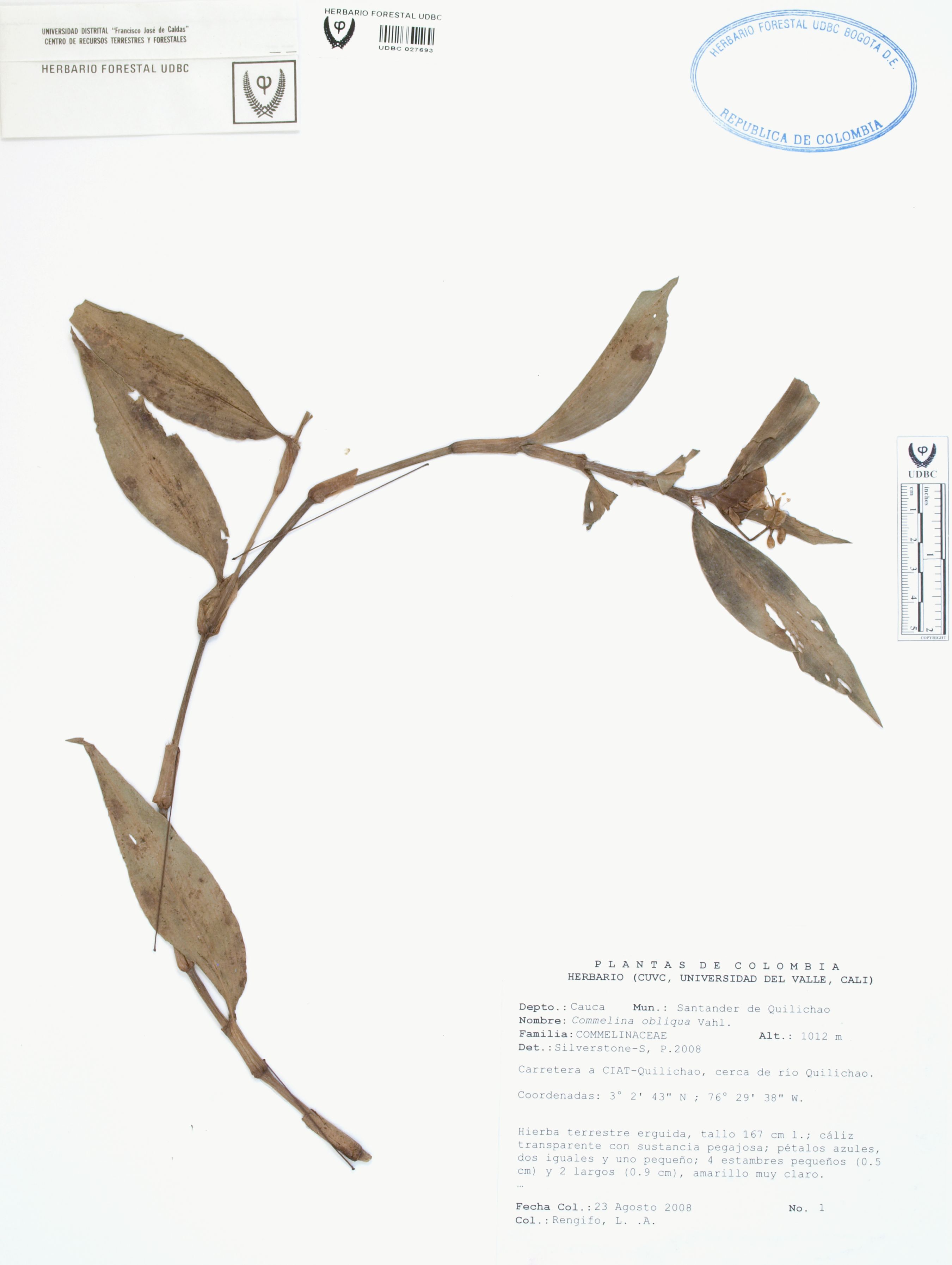 Fotografía del ejemplar Rengifo, L. 1, determinado como Commelina obliqua en el año 2008