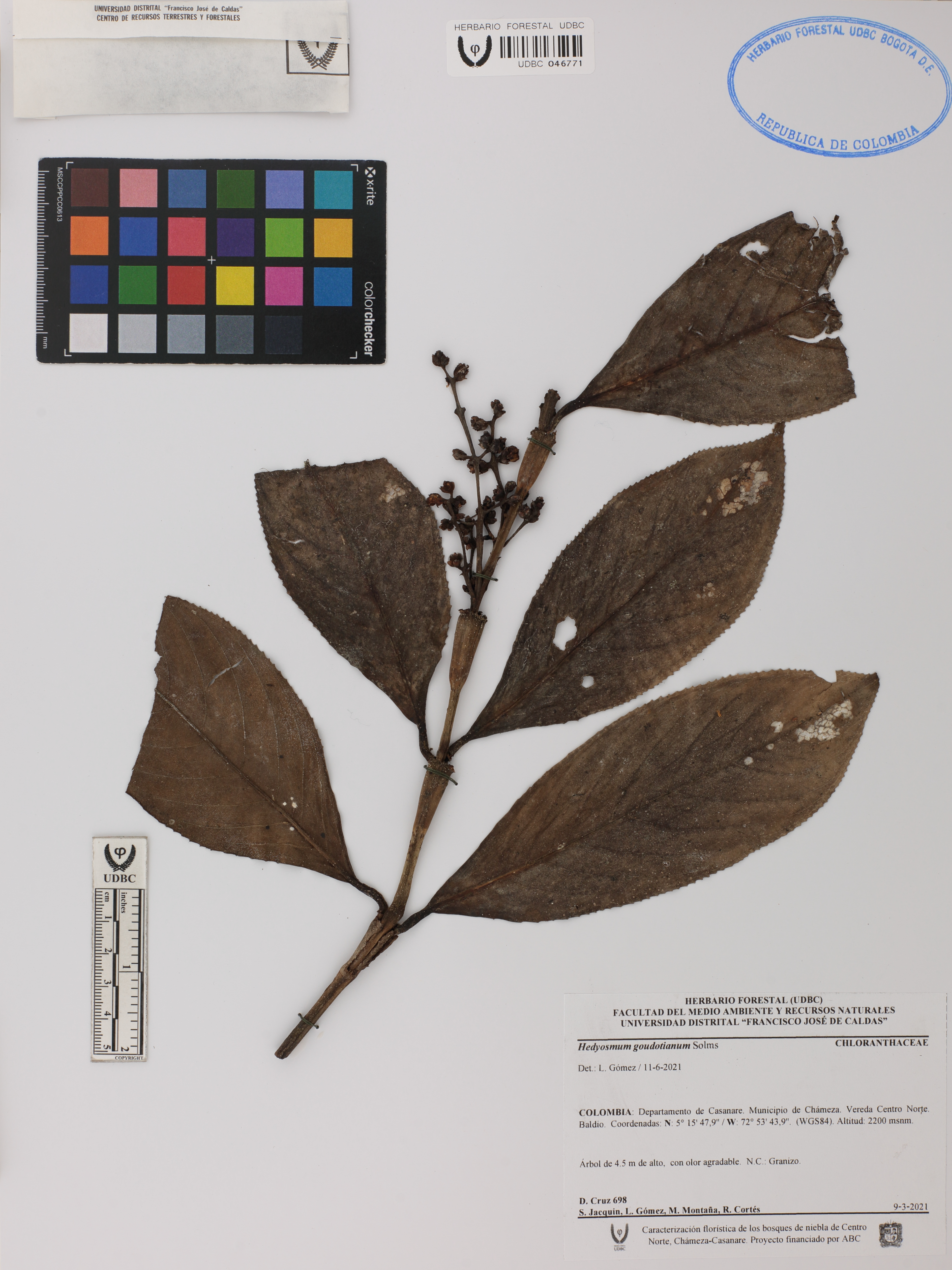 Fotografía del ejemplar Cruz, D. 698, determinado como Hedyosmum goudotianum en el año 2021