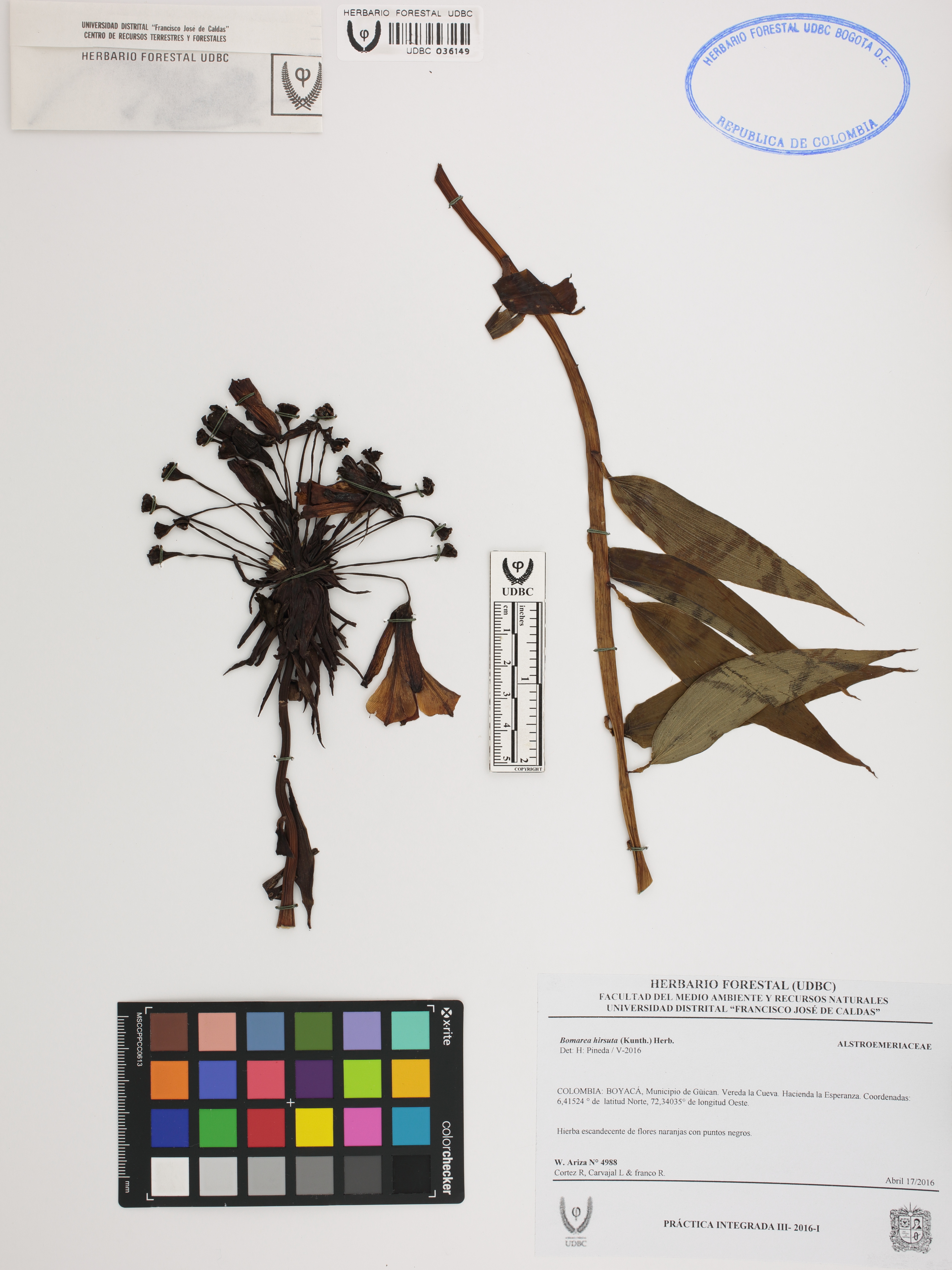 Fotografía del ejemplar Ariza, W. 4988, determinado como Bomarea hirsuta en el año 2016