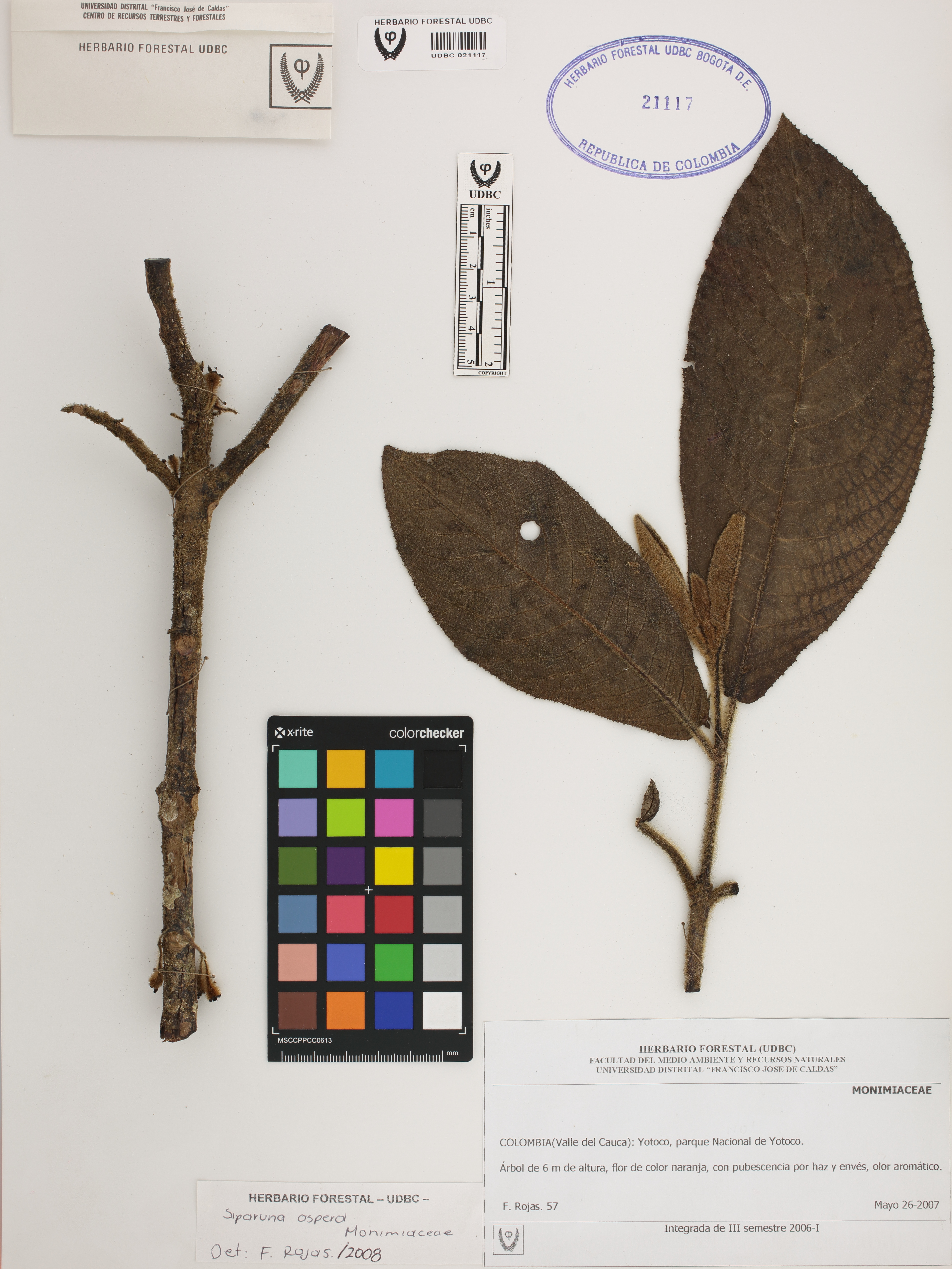 | dc.description | Fotografía del ejemplar Rojas, F. 57, determinado como Siparuna aspera en el año 2008 | |