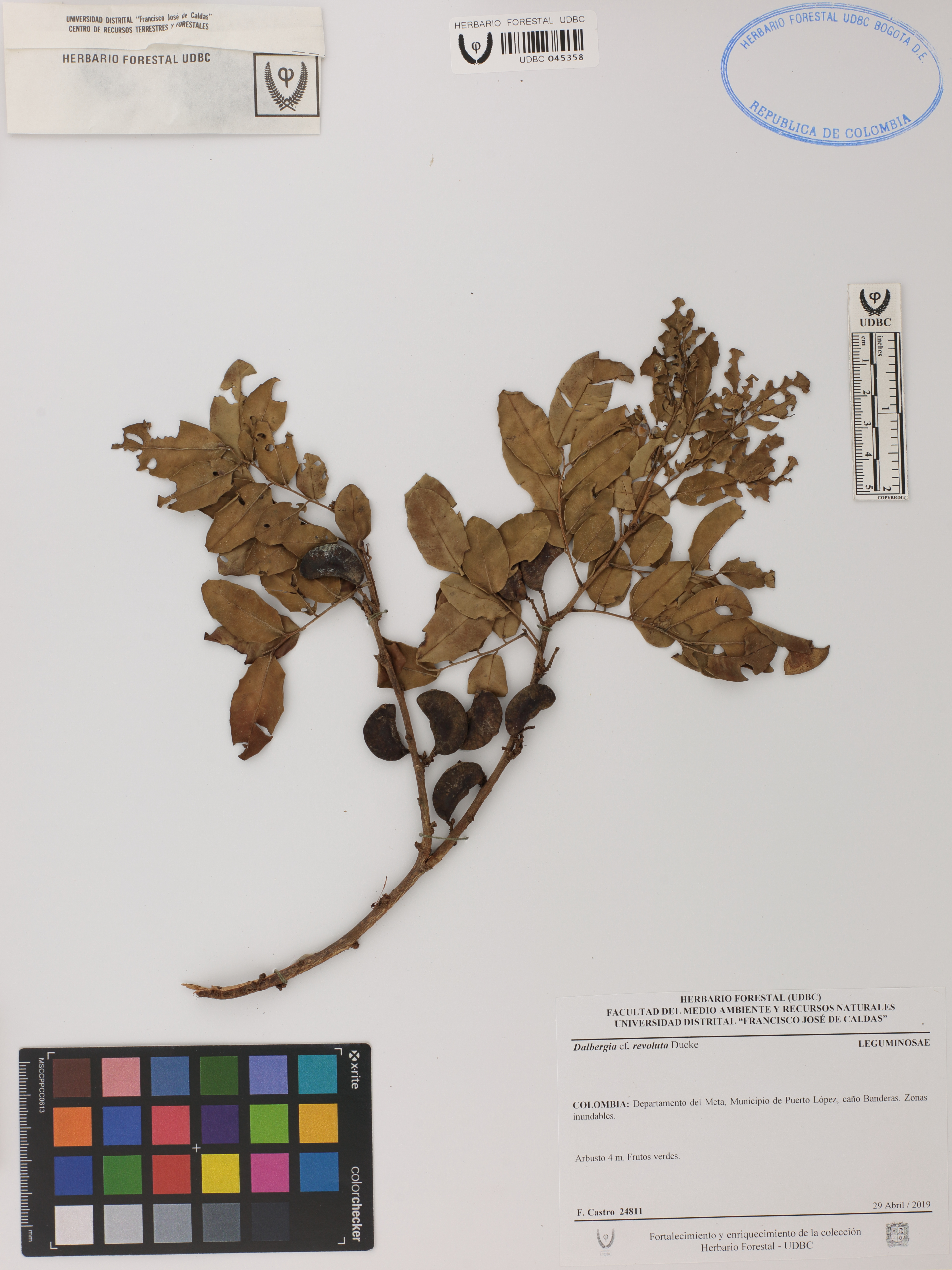 Fotografía del ejemplar Castro, F. 24811, determinado como Dalbergia revoluta en el año 2019