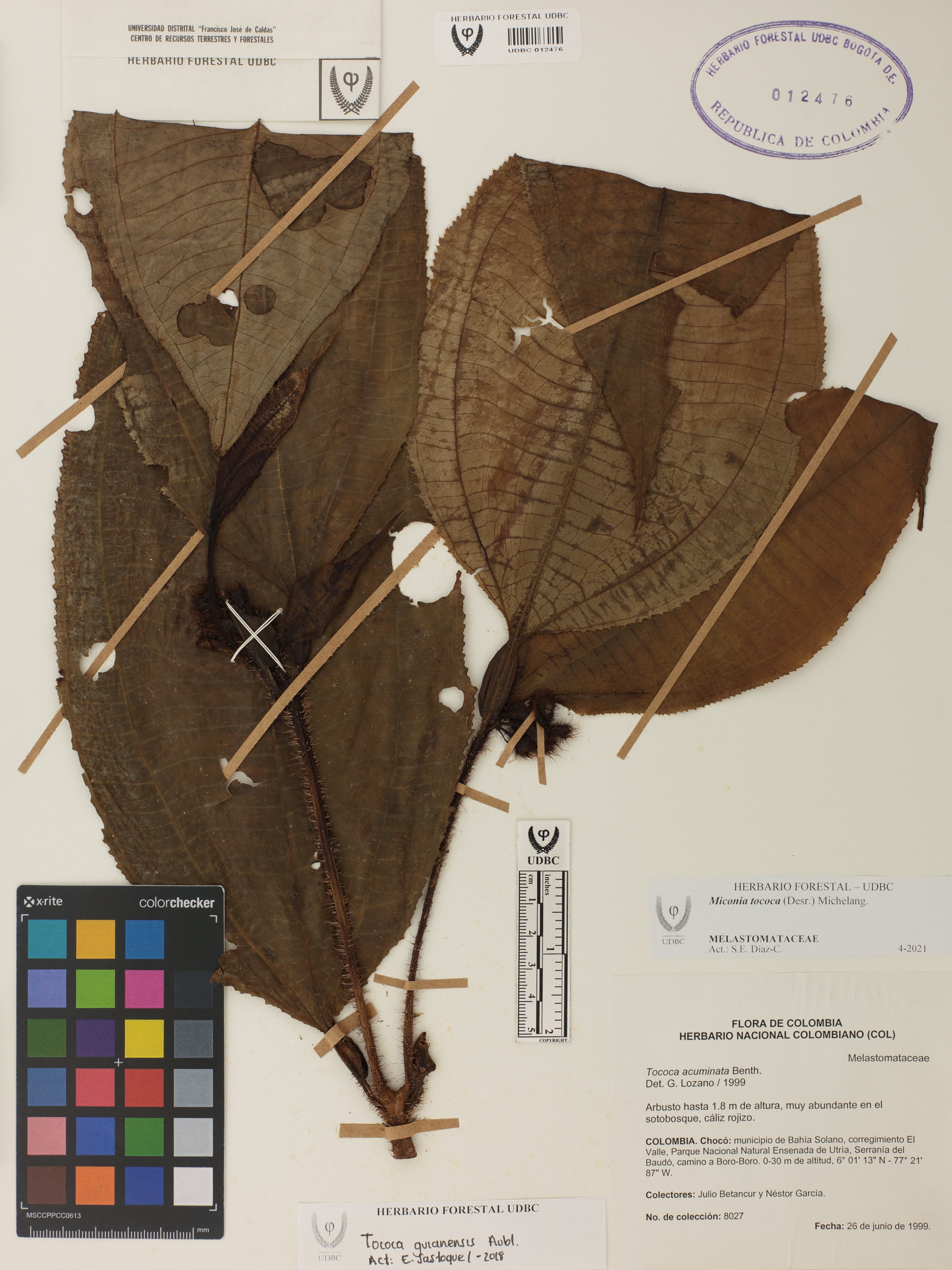 Fotografía del ejemplar Betancur, J. 8027, determinado como Miconia tococa en el año 1999