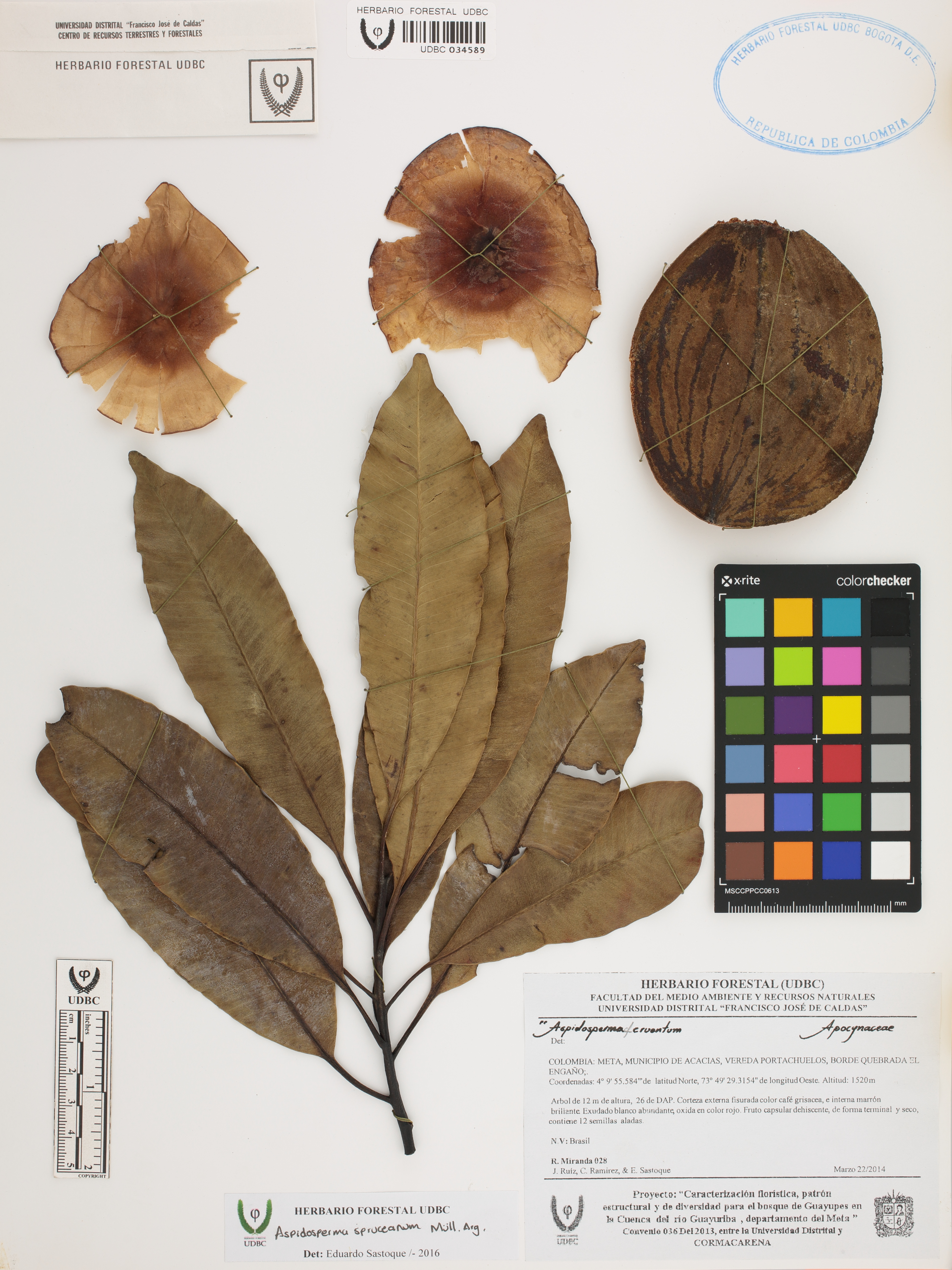 Fotografía del ejemplar Miranda, R. 28, determinado como Aspidosperma spruceanum en el año 2016
