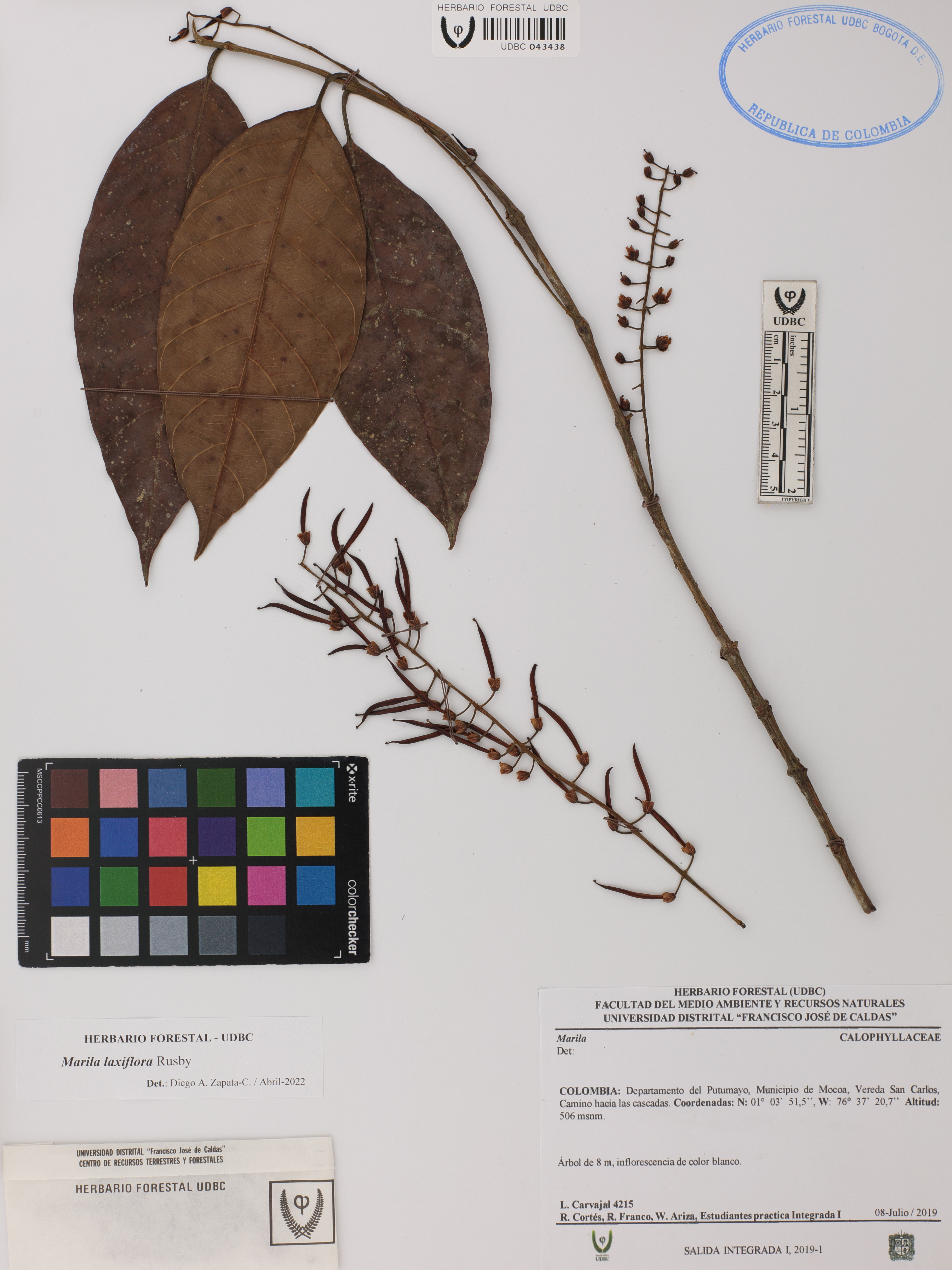 Fotografía del ejemplar Carvajal, L. 4215, determinado como Marila laxiflora en el año 2022