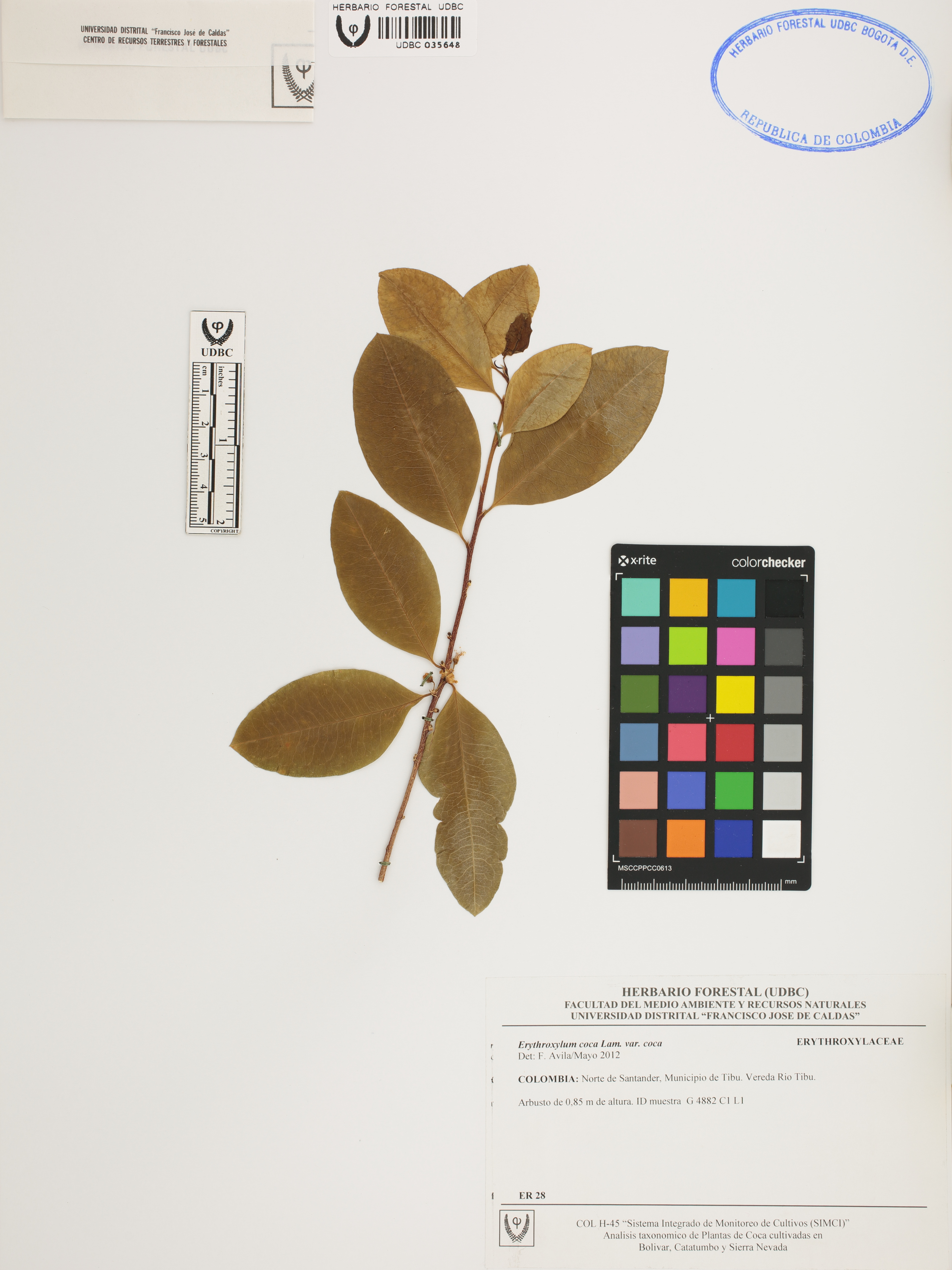 Fotografía del ejemplar SD 28, determinado como Erythroxylum coca var. coca en el año 2012