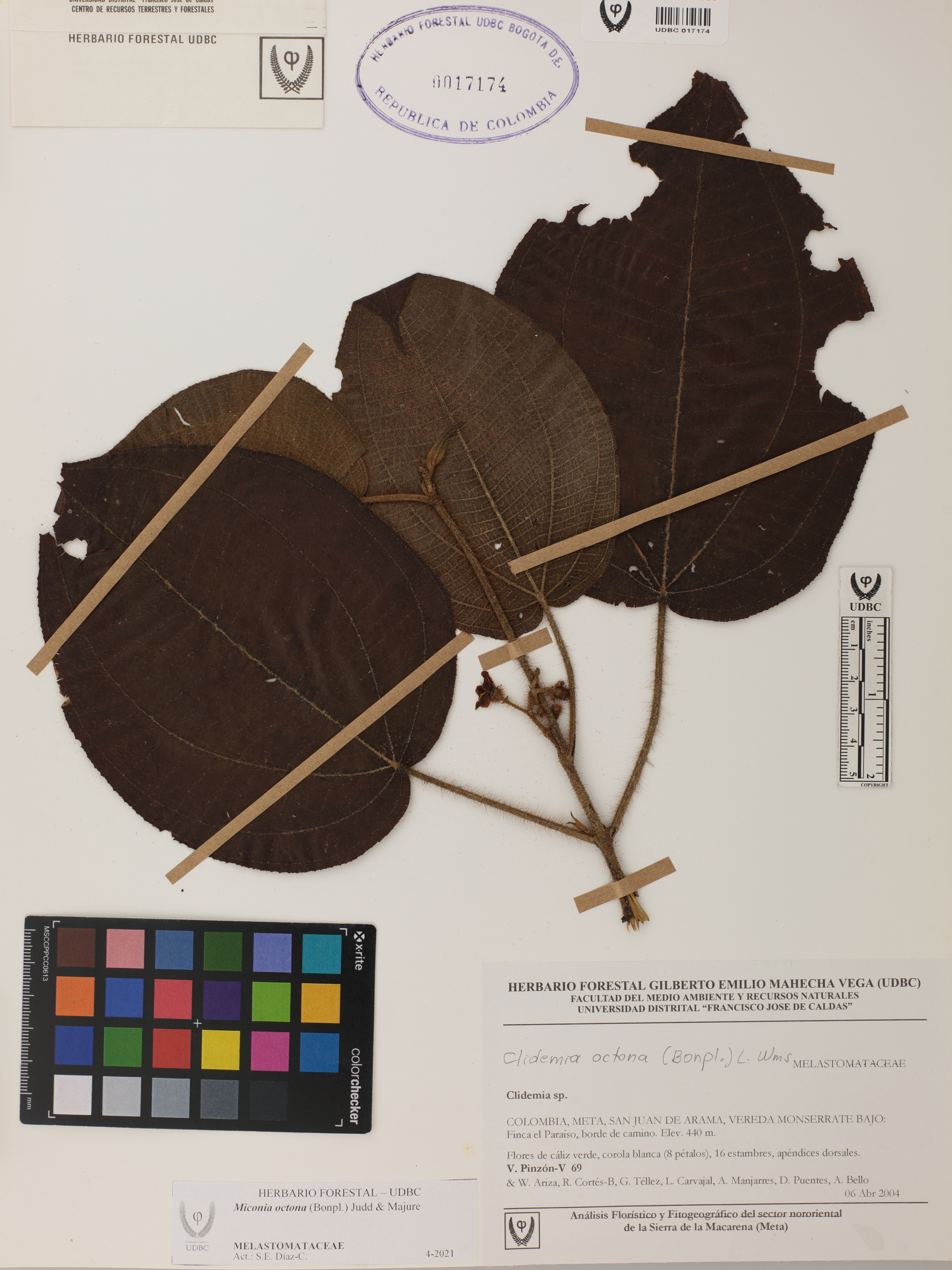 Fotografía del ejemplar Pinzón, V. 69, determinado como Miconia octona en el año 2005