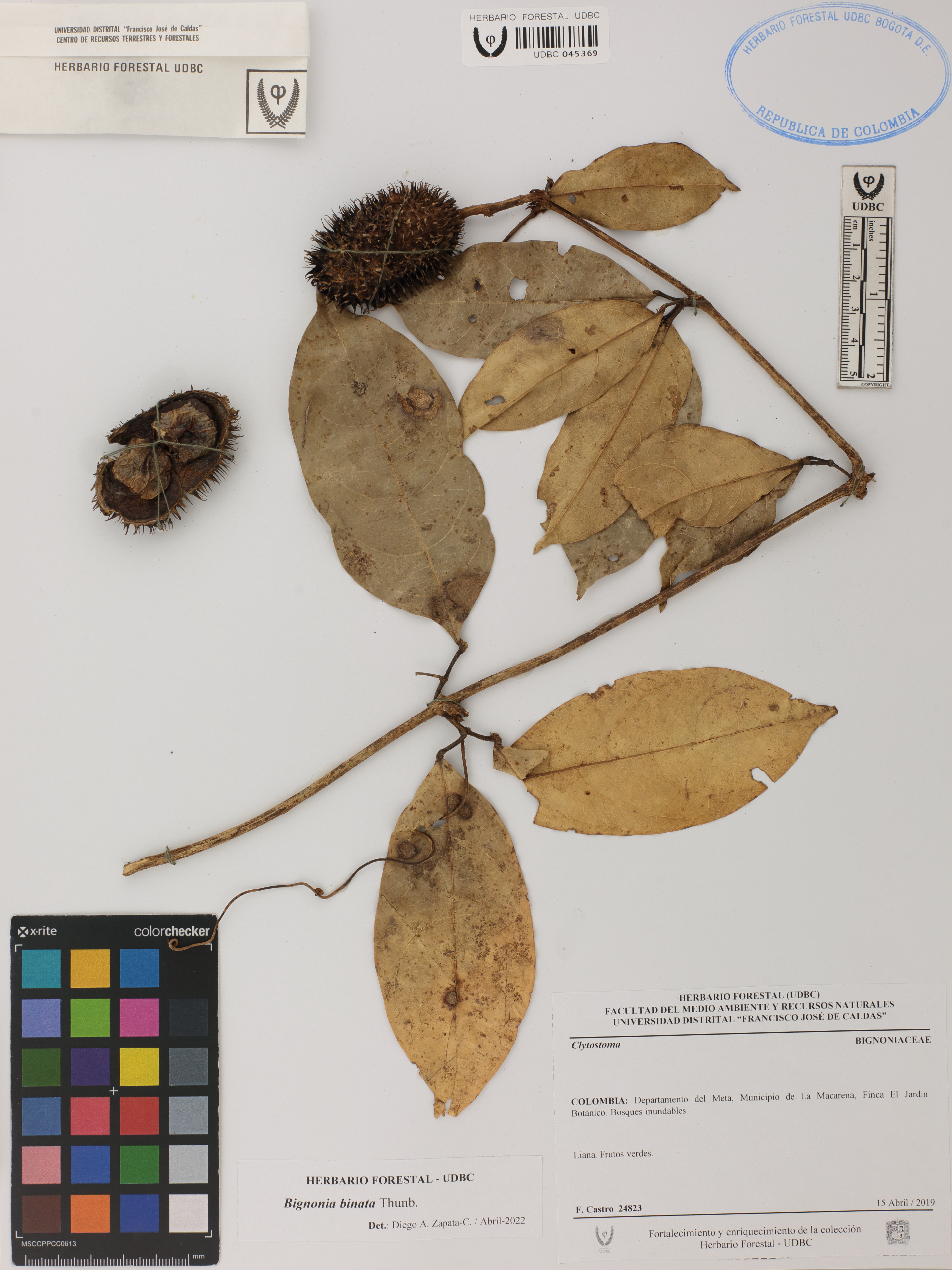 Fotografía del ejemplar Castro, F. 24823, determinado como Bignonia binata en el año 2022