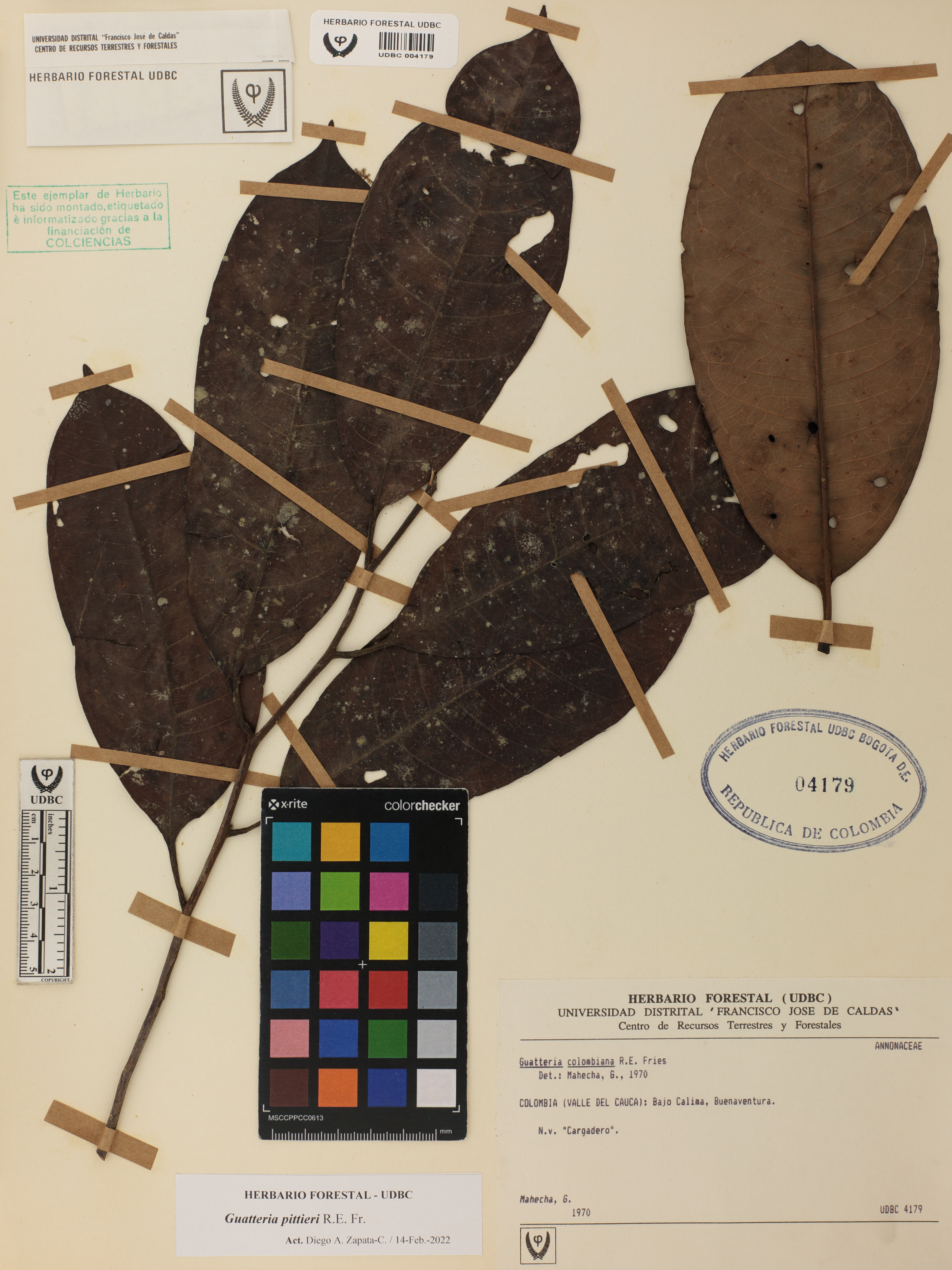 Fotografía del ejemplar Mahecha, G., determinado como Guatteria pittieri en el año 1970