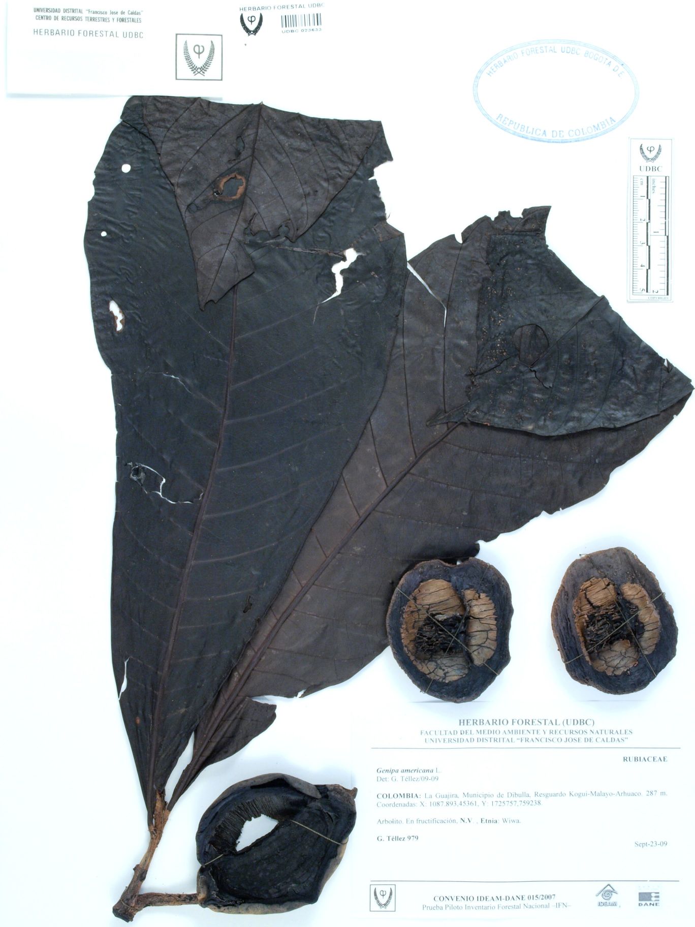 Fotografía del ejemplar Téllez, G. 979, determinado como Genipa americana en el año 2009