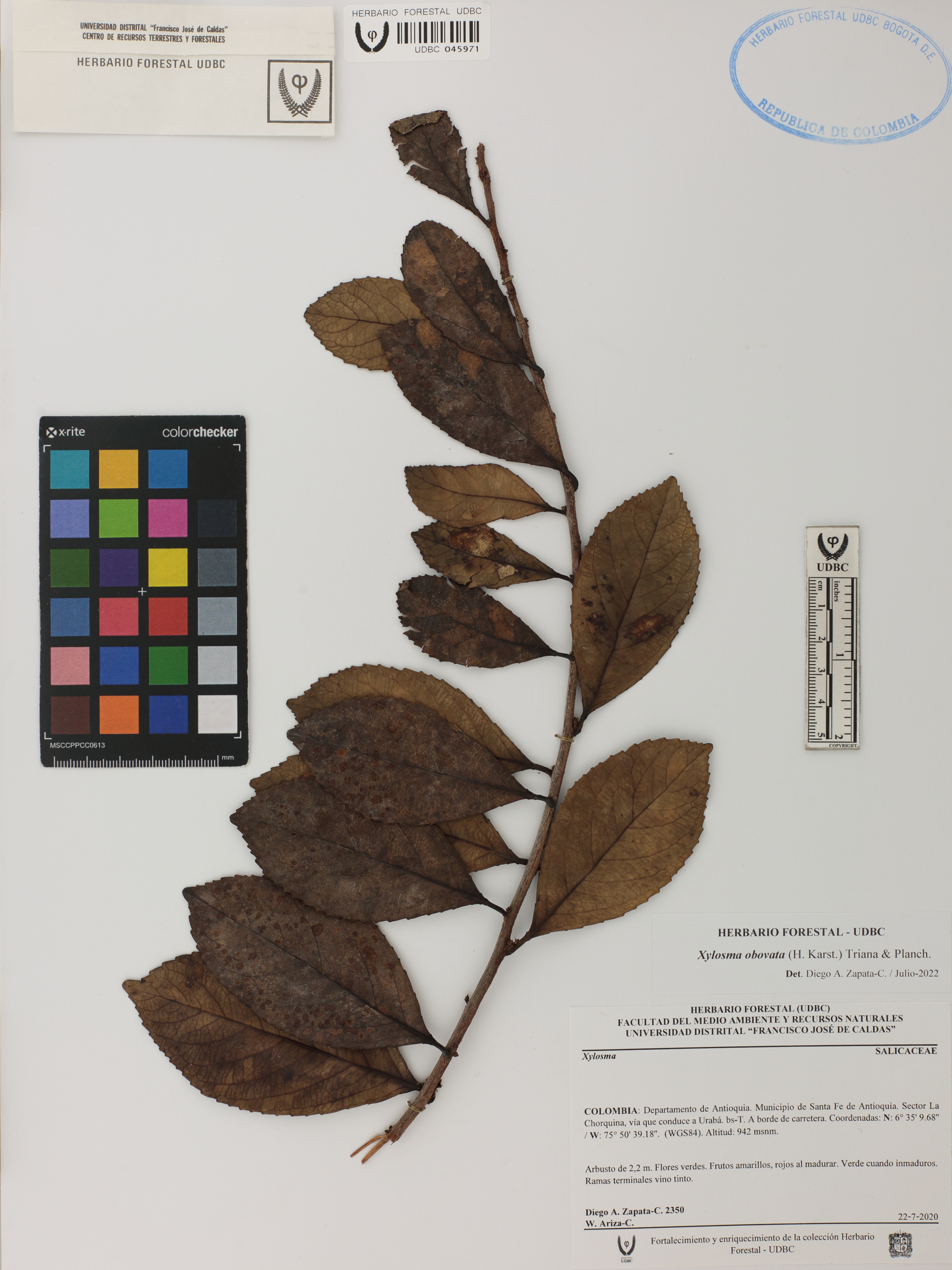 Fotografía del ejemplar Zapata-C., D. 2350, determinado como Xylosma obovata en el año 2022