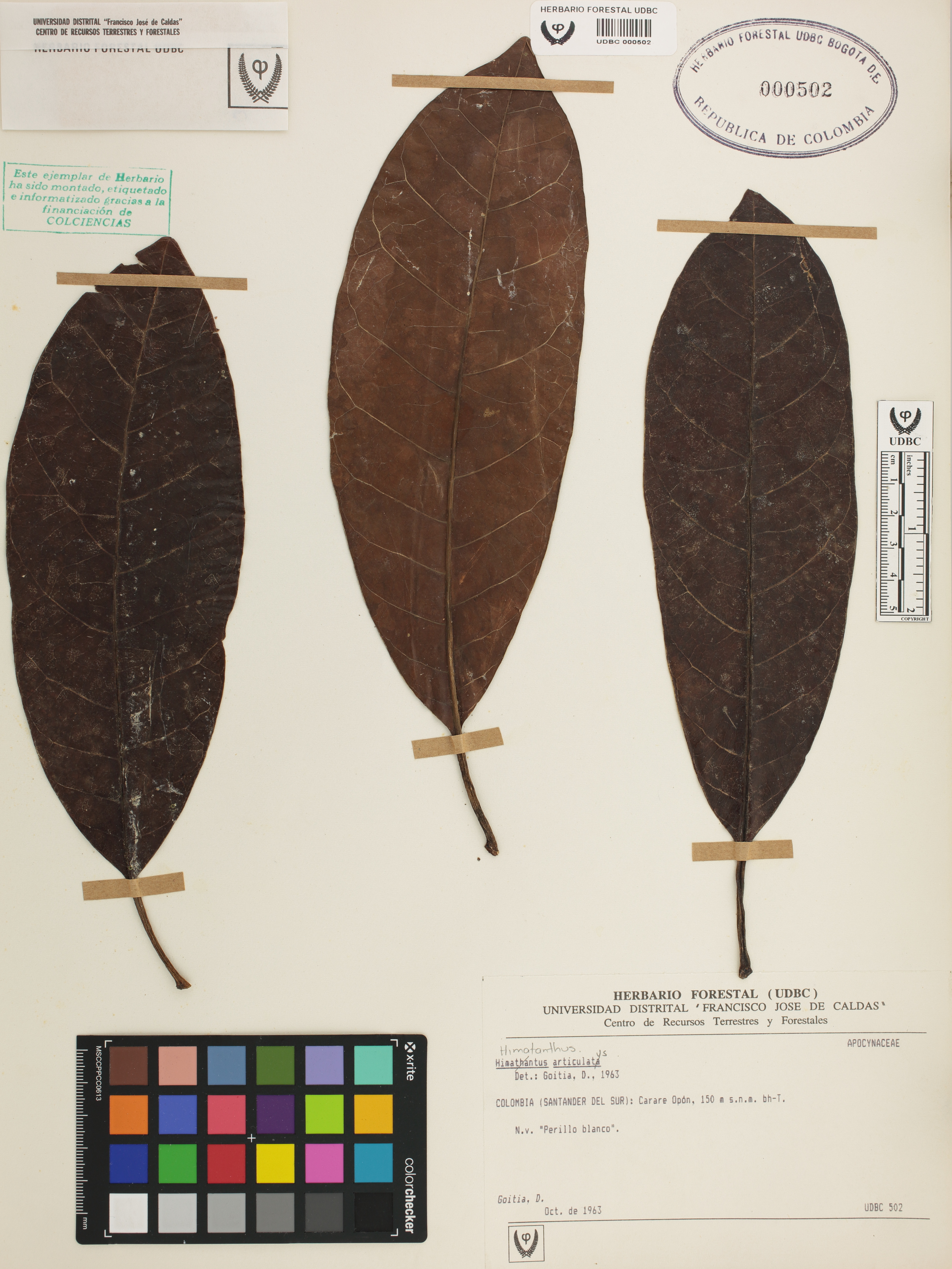 Fotografía del ejemplar Goitia, D., determinado como Himatanthus articulatus en el año 1963