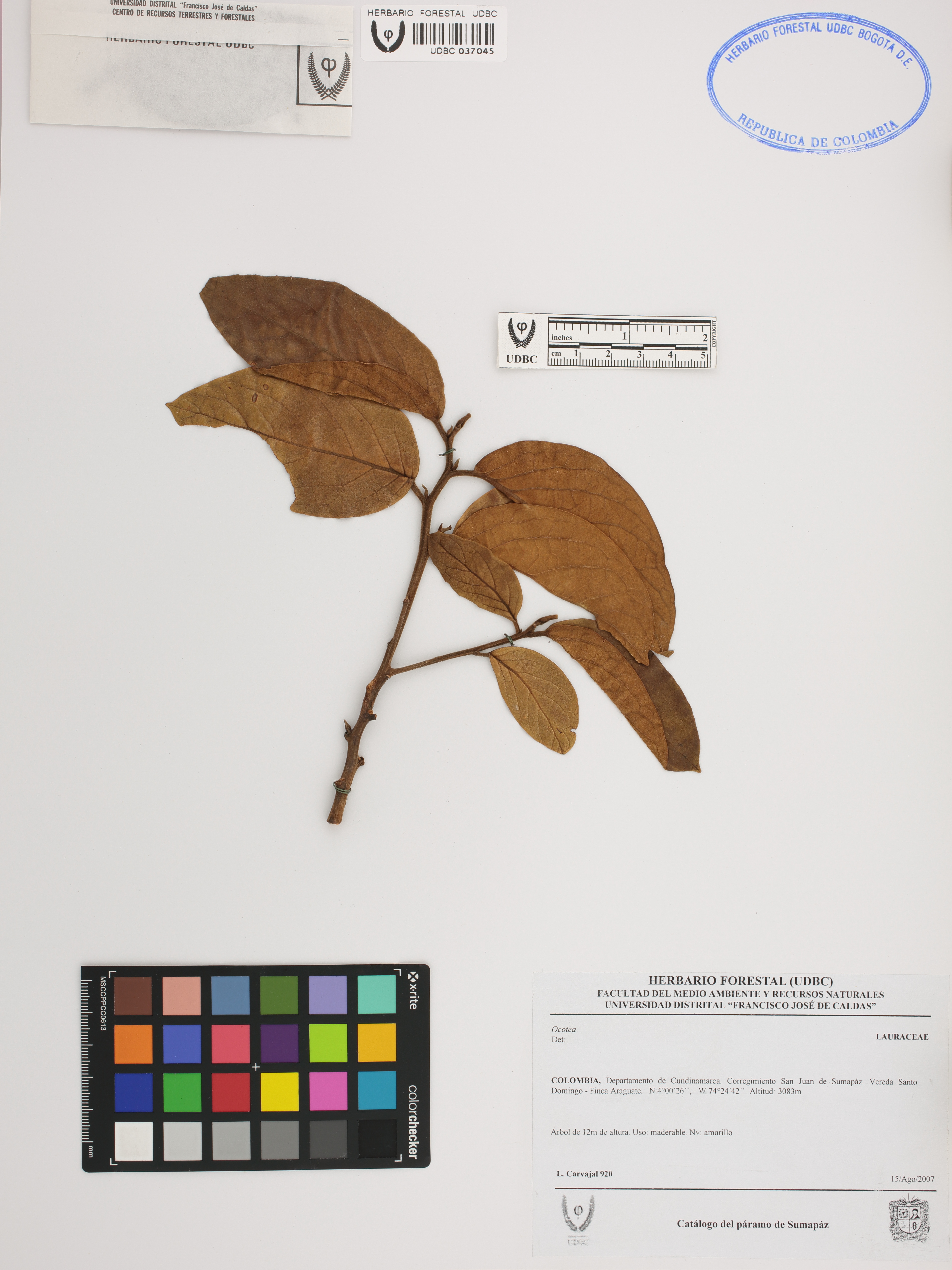 Fotografía del ejemplar Carvajal, L. 920, determinado como Ocotea pedicellata en el año 2023
