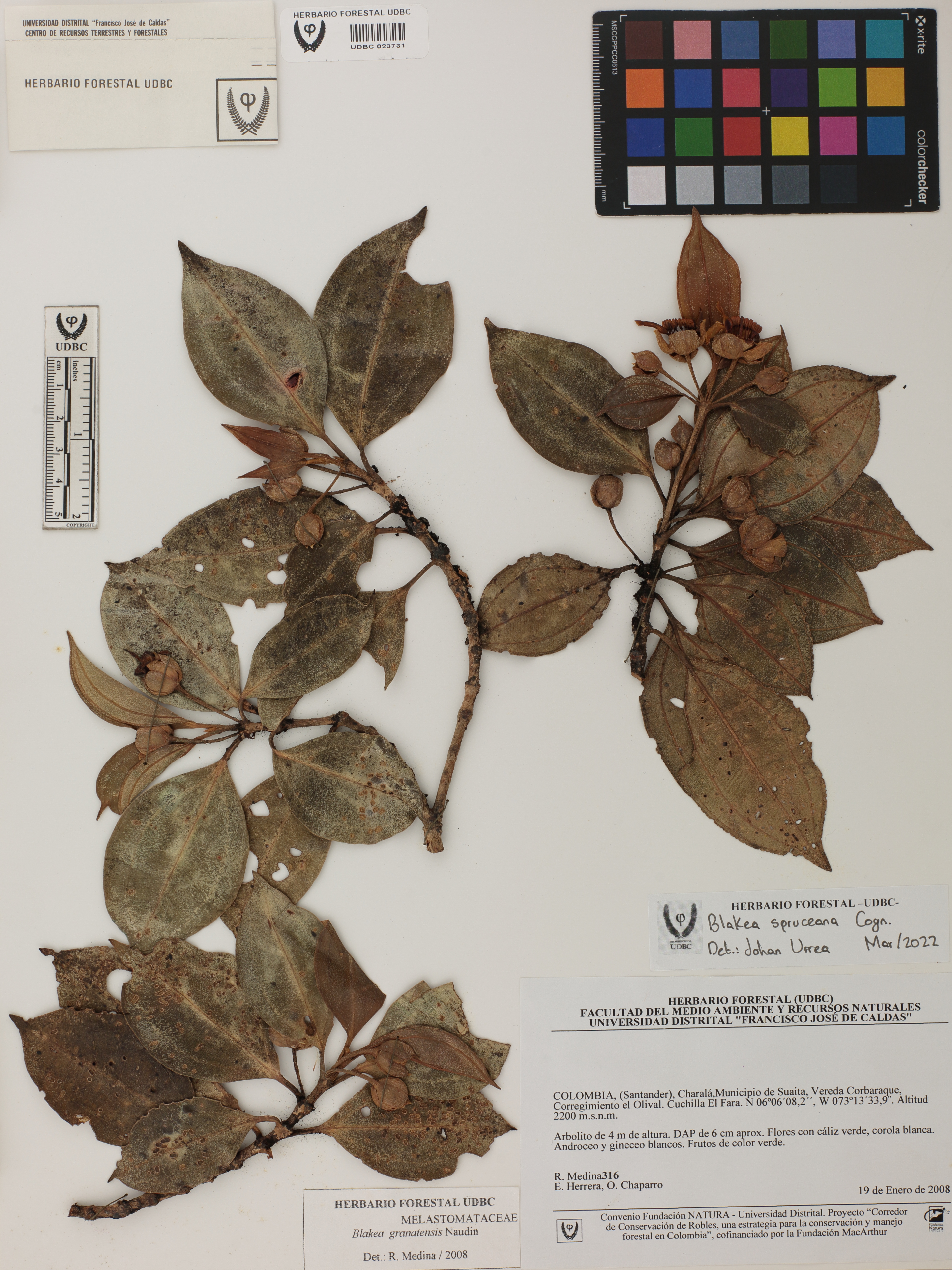 Fotografía del ejemplar Medina, R. 316, determinado como Blakea spruceana en el año 2022