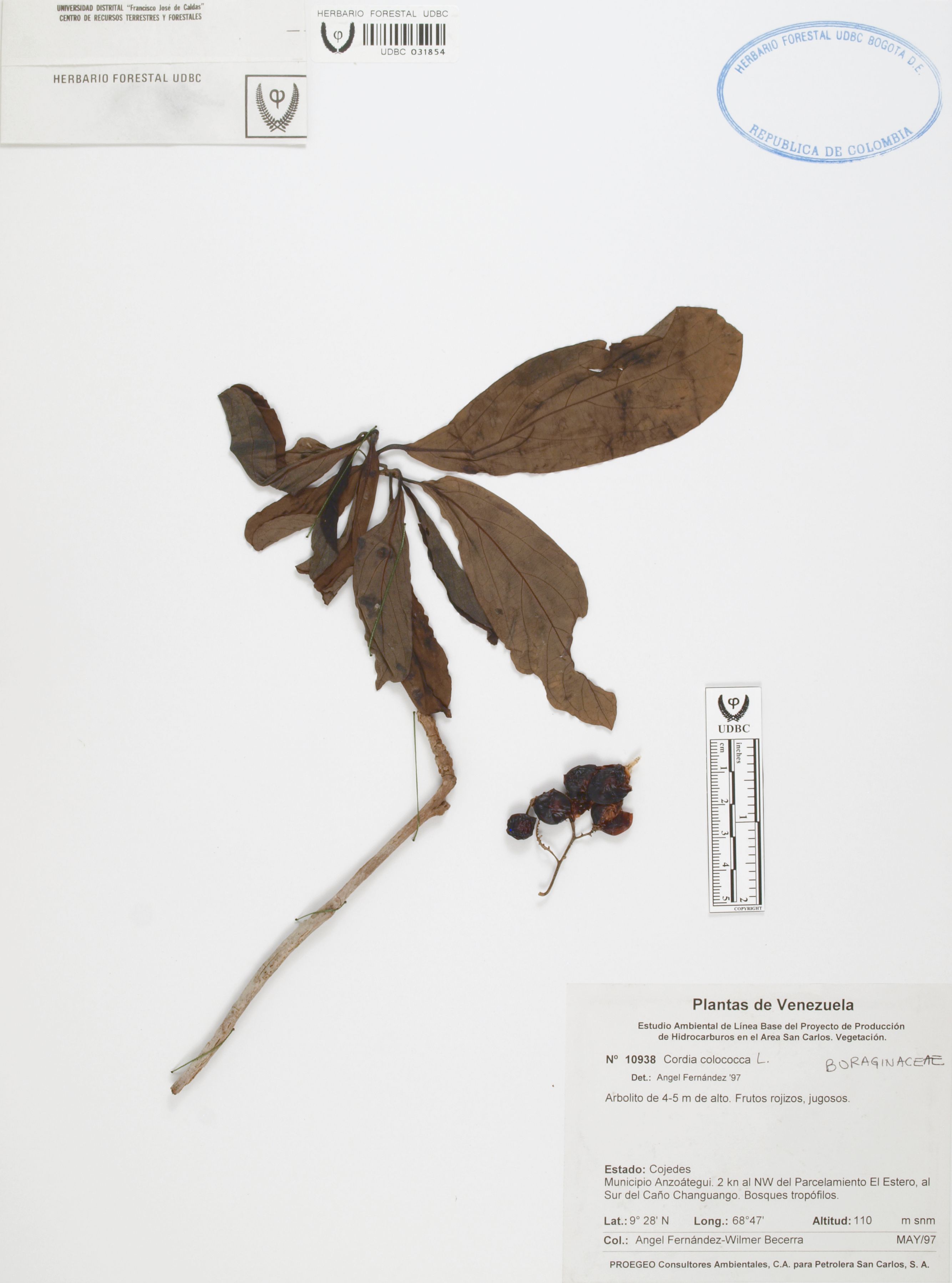 Fotografía del ejemplar Fernández, A. 10938, determinado como Cordia collococca en el año 1997