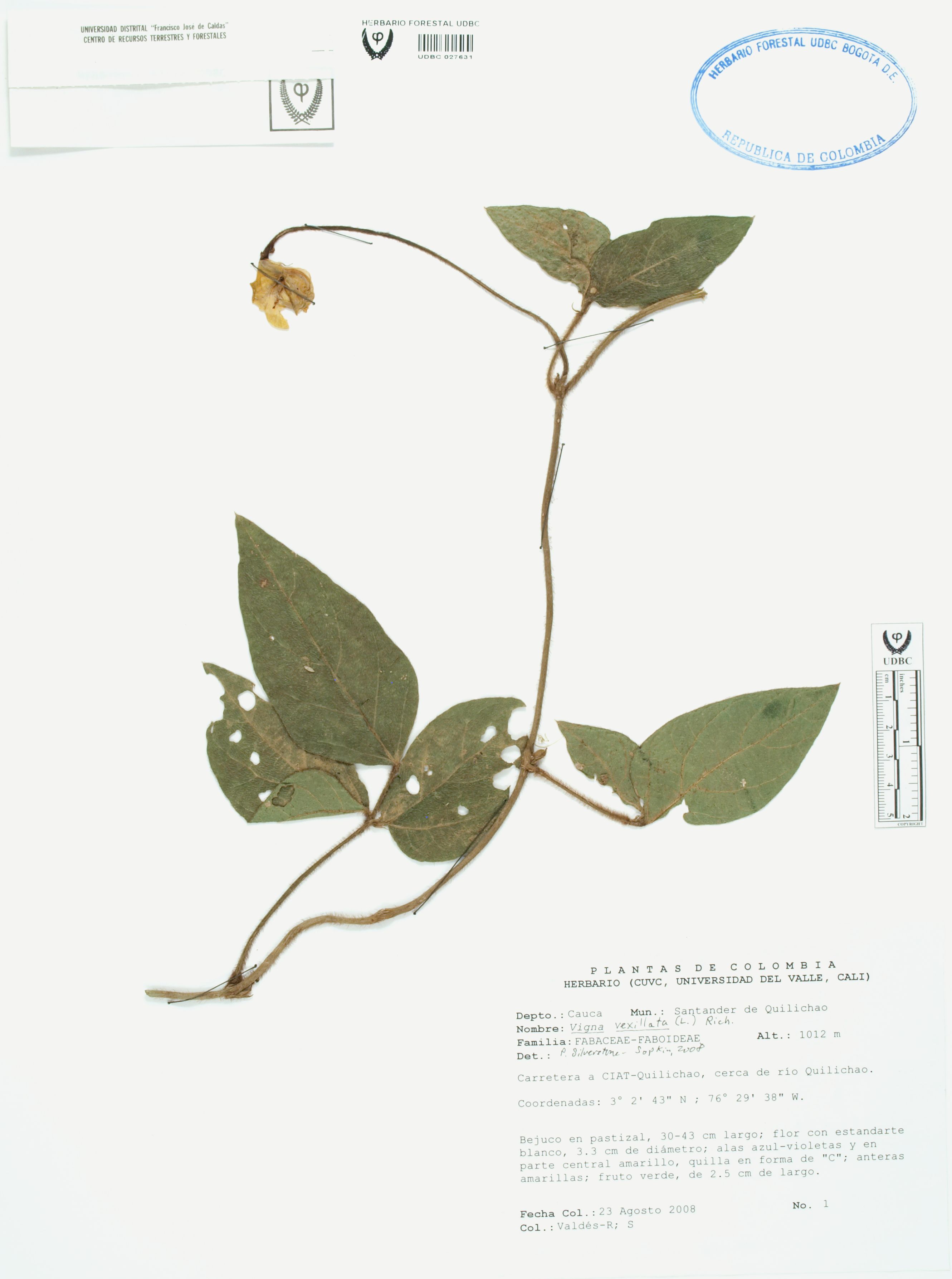 Fotografía del ejemplar Valdés-R., S. 1, determinado como Vigna vexillata en el año 2008