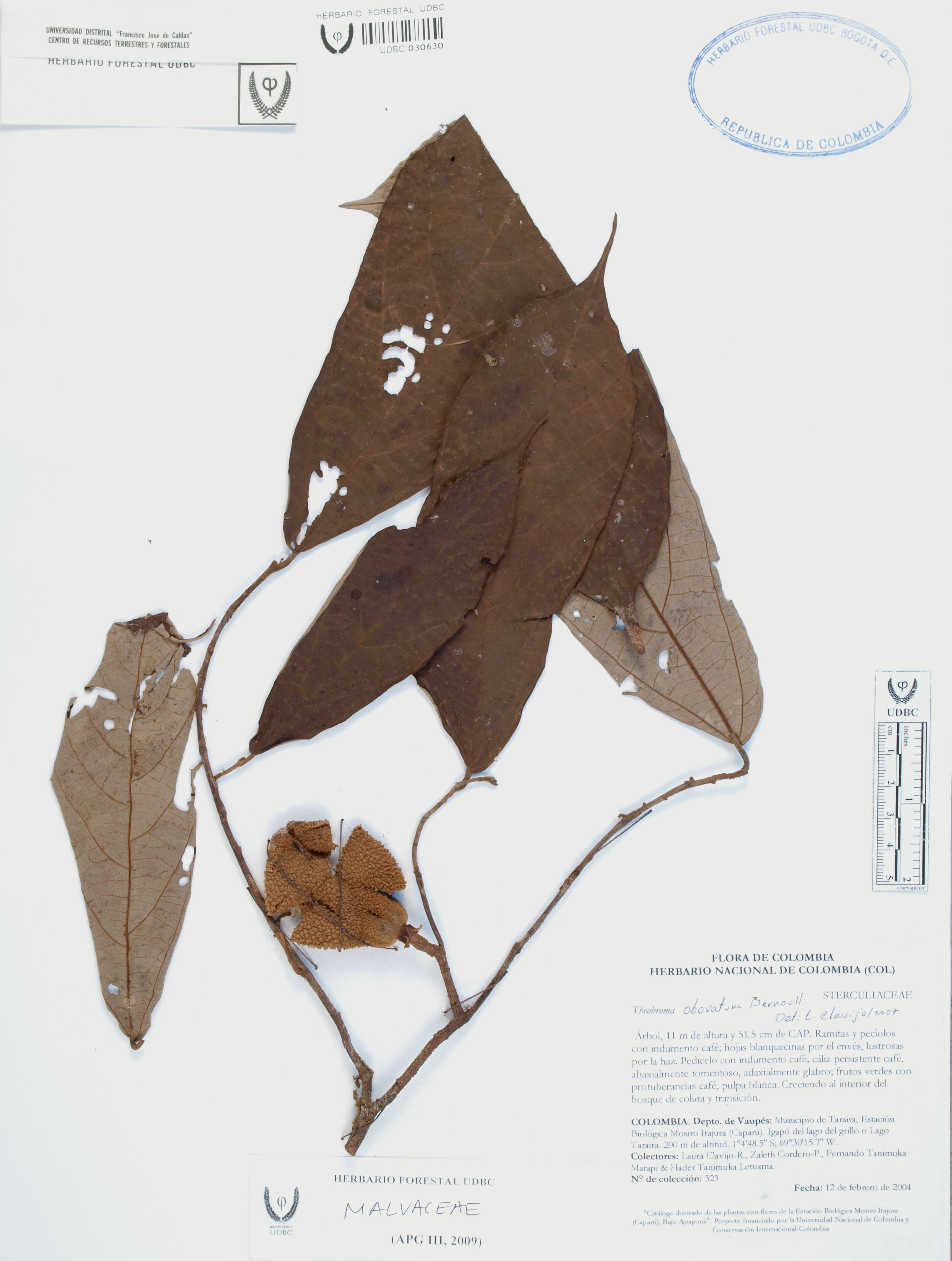 Fotografía del ejemplar Clavijo-R., L. 323, determinado como Theobroma obovatum en el año 2007