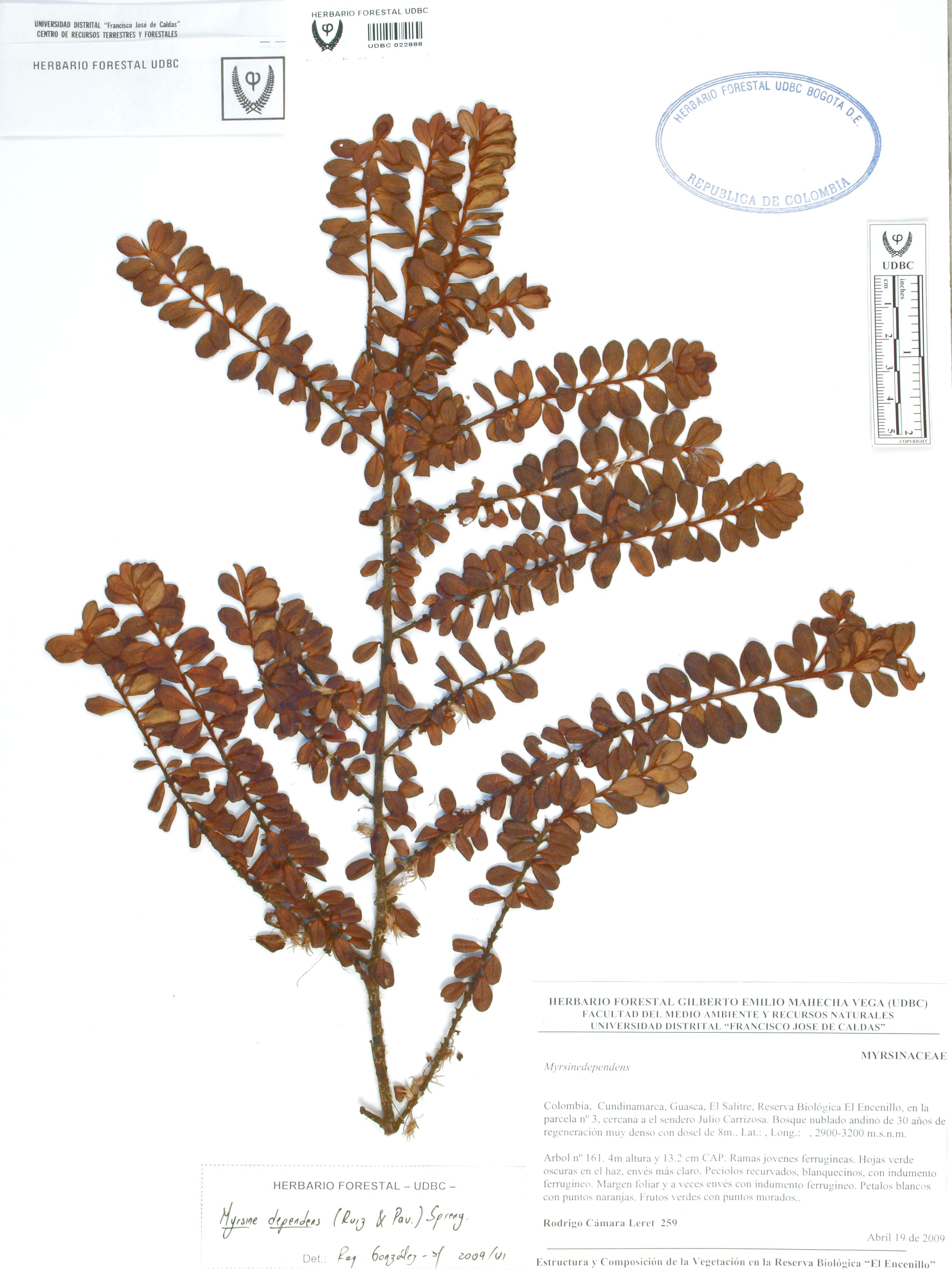 Fotografía del ejemplar Cámara, R. 259, determinado como Myrsine dependens en el año 2009