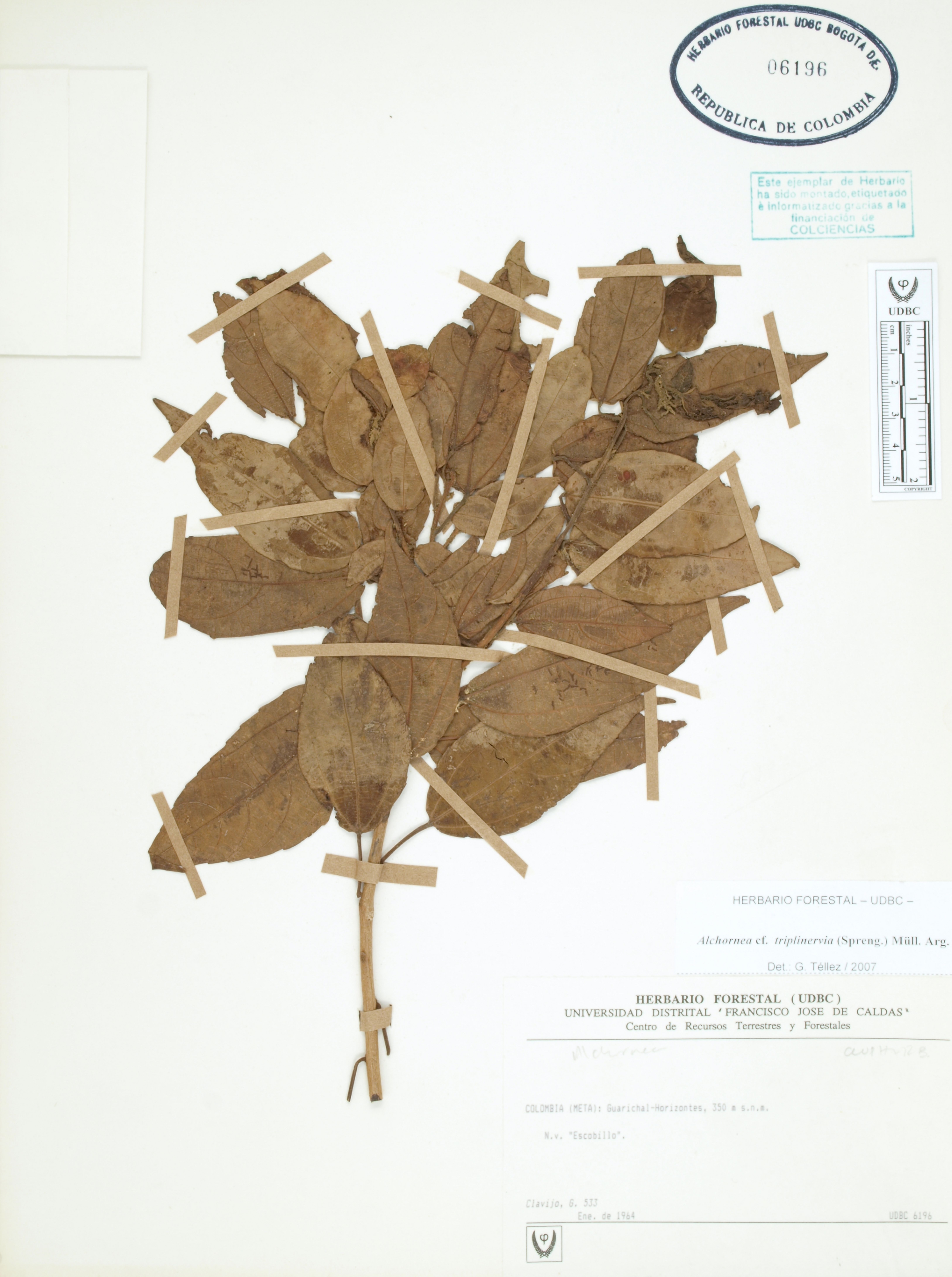 Fotografía del ejemplar Clavijo, G. 533, determinado como Alchornea triplinervia en el año 2007