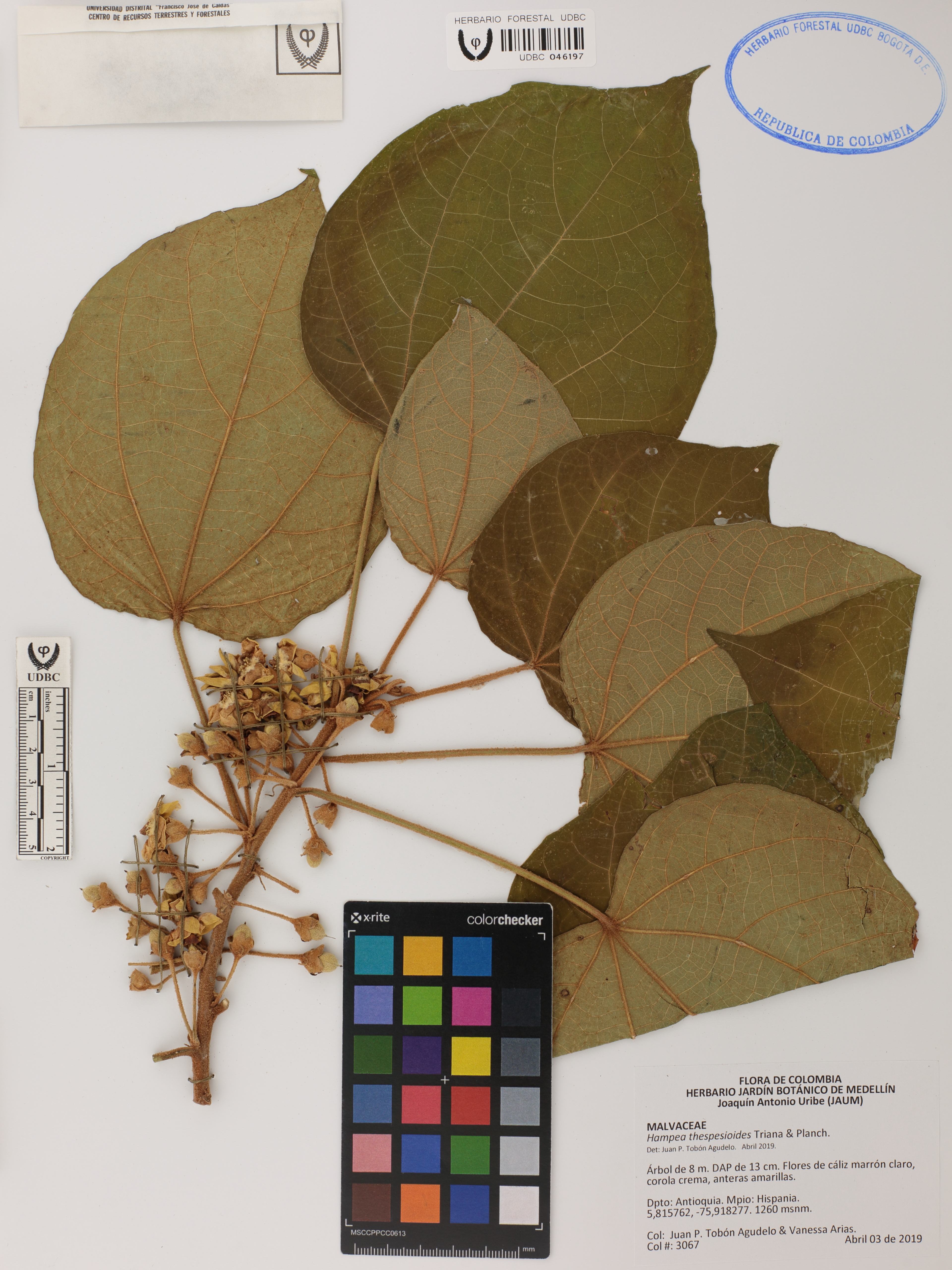 Fotografía del ejemplar Tobón-Agudelo, J. 3067, determinado como Hampea thespesioides en el año 2019