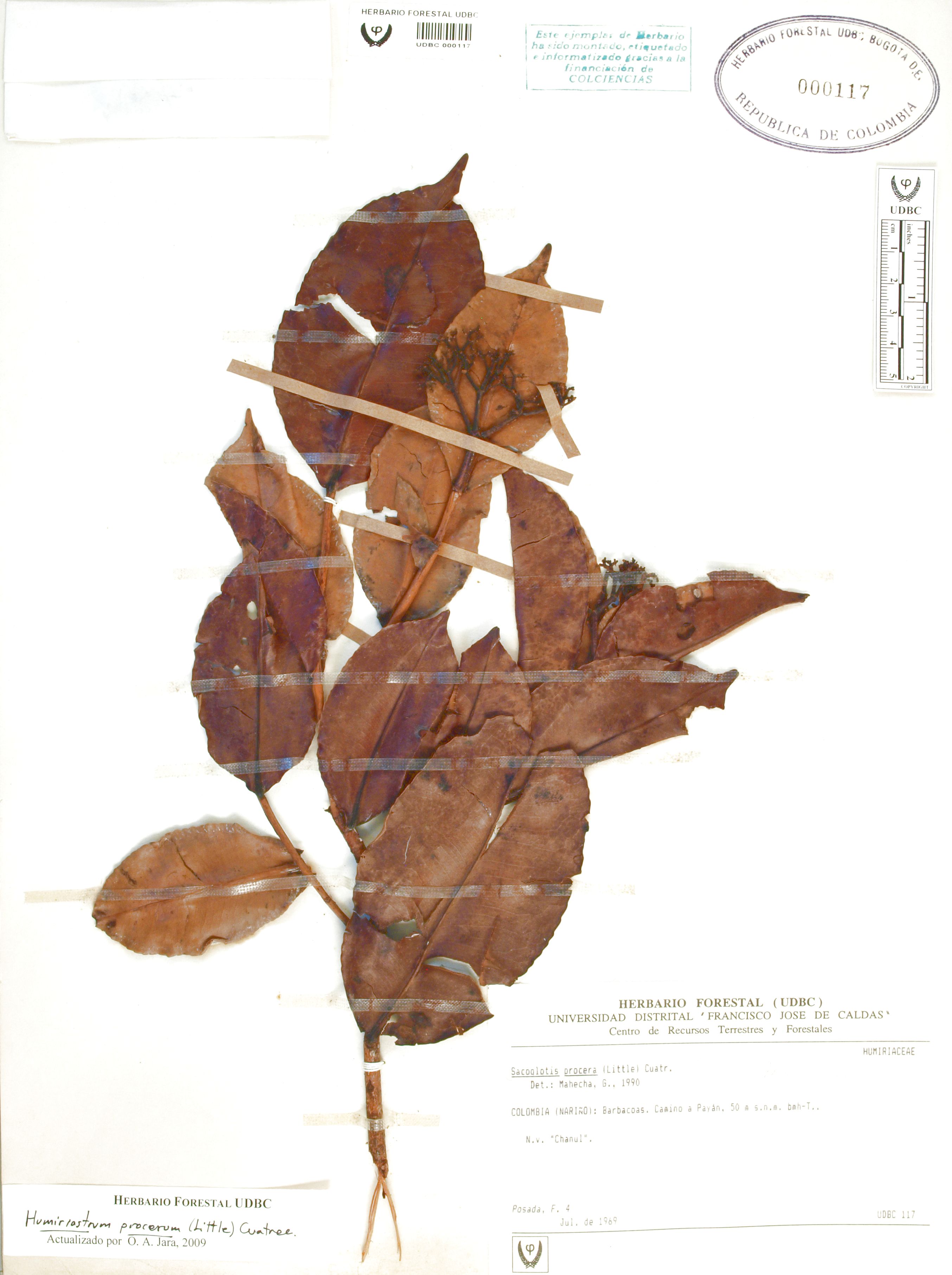 Fotografía del ejemplar Posada, F. 4, determinado como Humiriastrum procerum en el año 2009