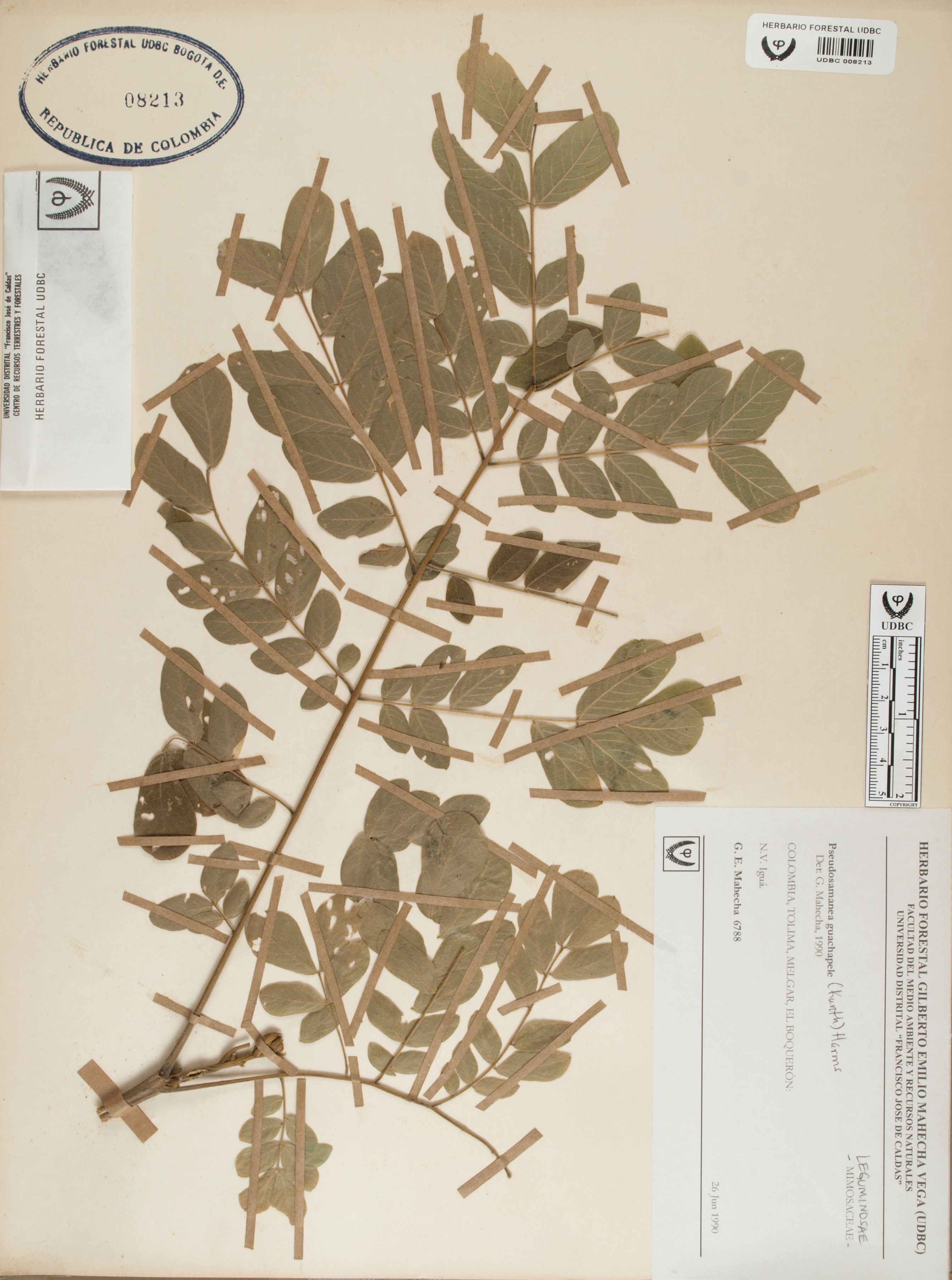 Fotografía del ejemplar Mahecha, G. 6788, determinado como Pseudosamanea guachapele en el año 1990