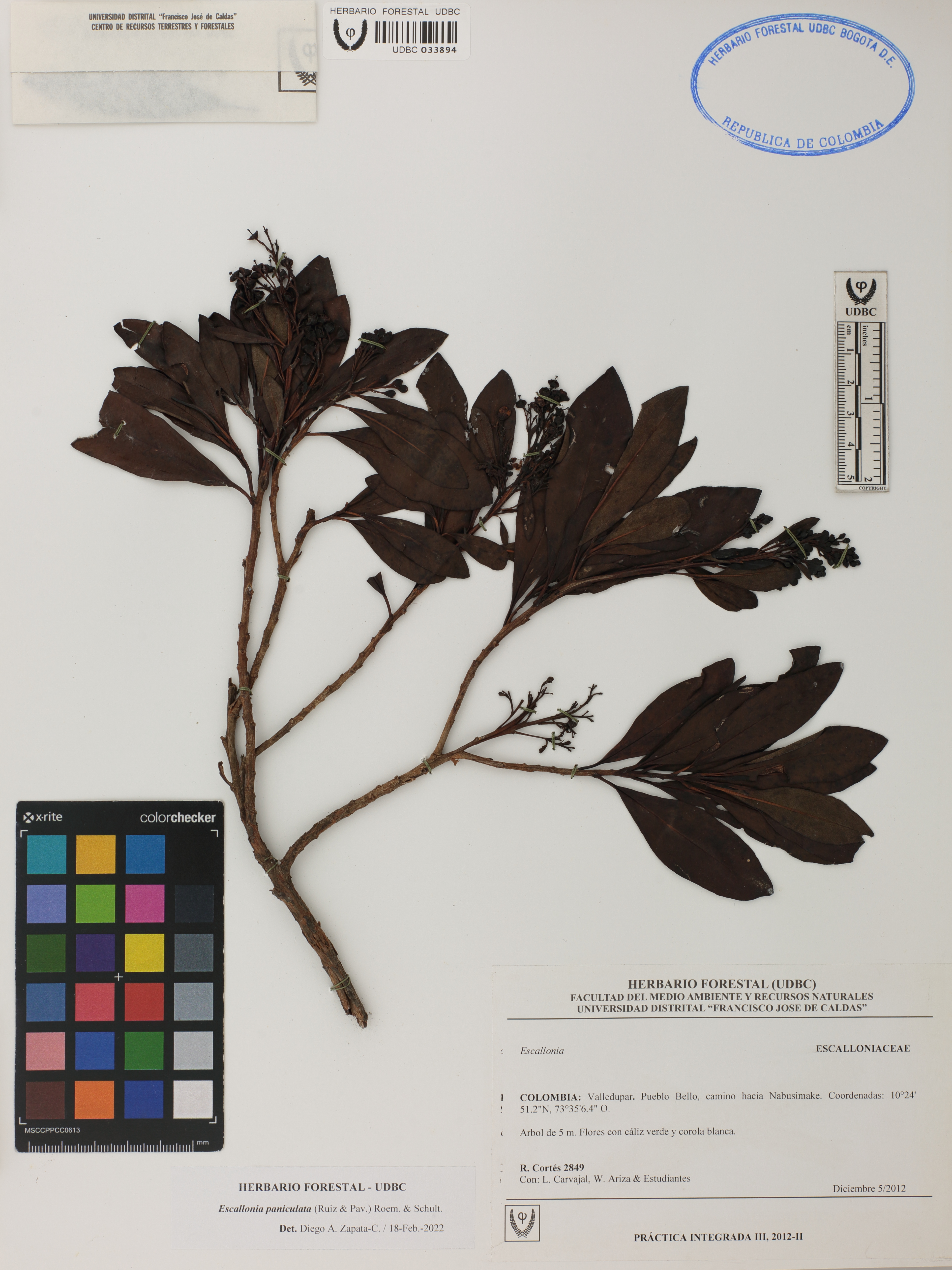 Fotografía del ejemplar Cortés, R. 2849, determinado como Escallonia paniculata en el año 2022