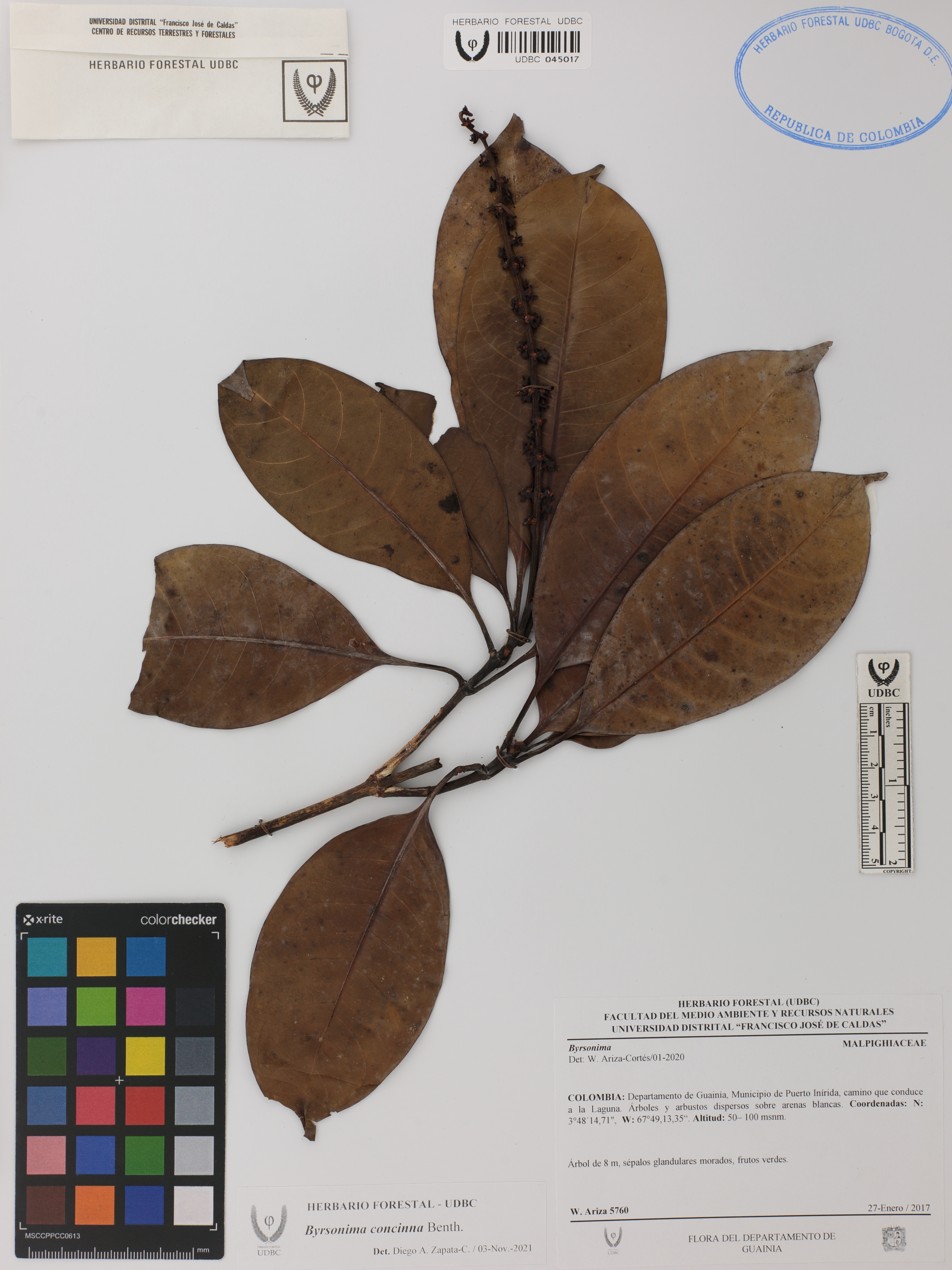 Fotografía del ejemplar Ariza-Cortés, W. 5760, determinado como Byrsonima concinna en el año 2021