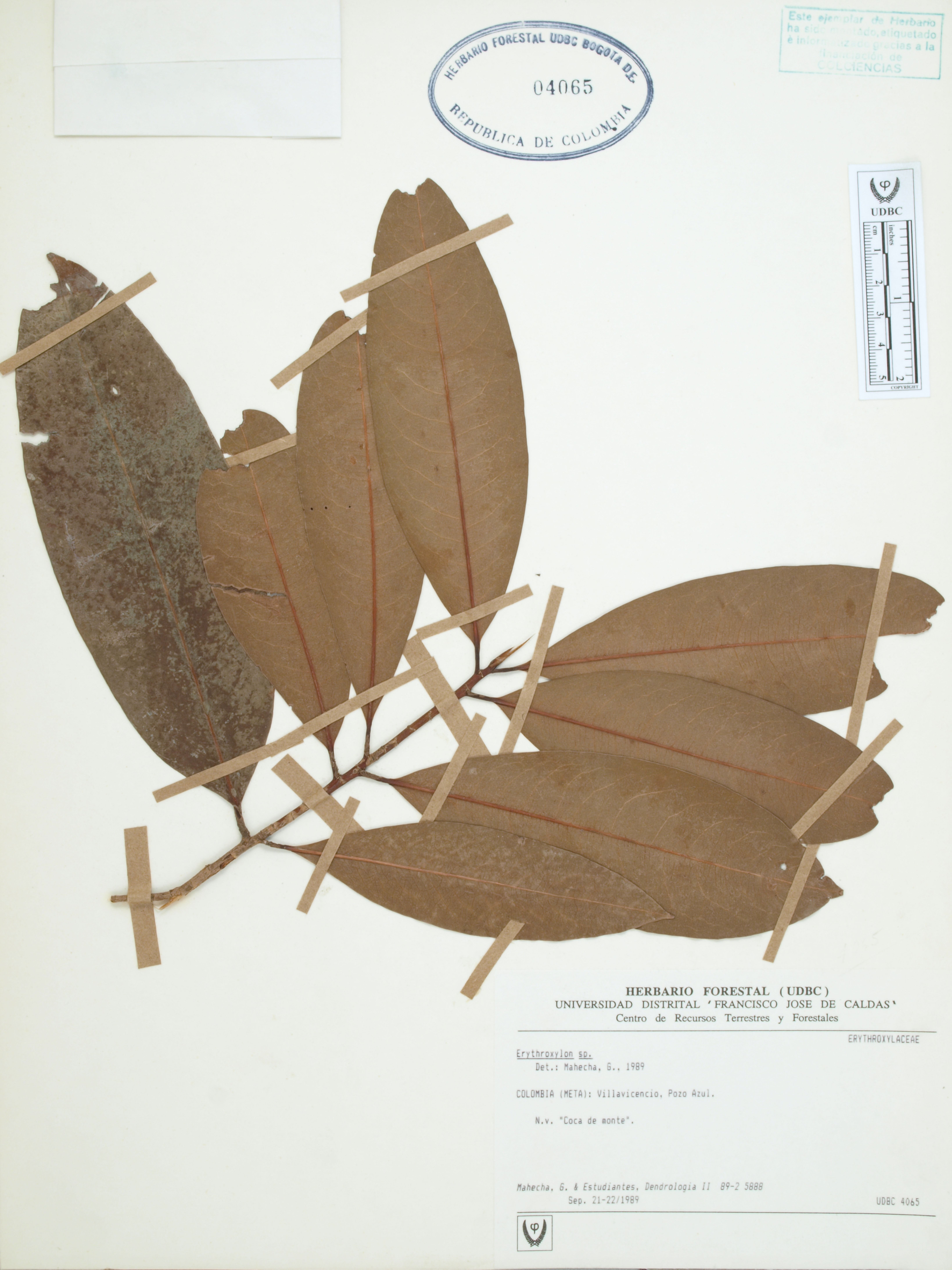 Fotografía del ejemplar Mahecha, G. 5888, determinado como Erythroxylum macrophyllum en el año 2009