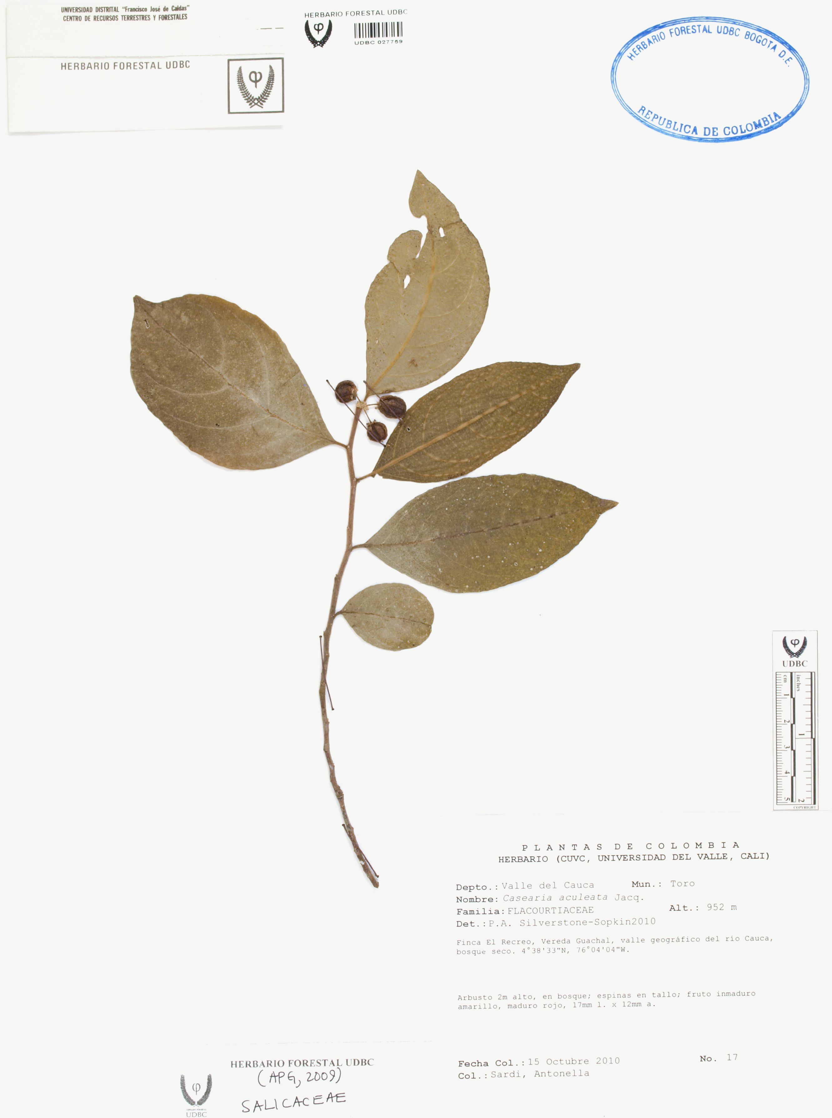 Fotografía del ejemplar Sardi, A. 17, determinado como Casearia aculeata en el año 2010