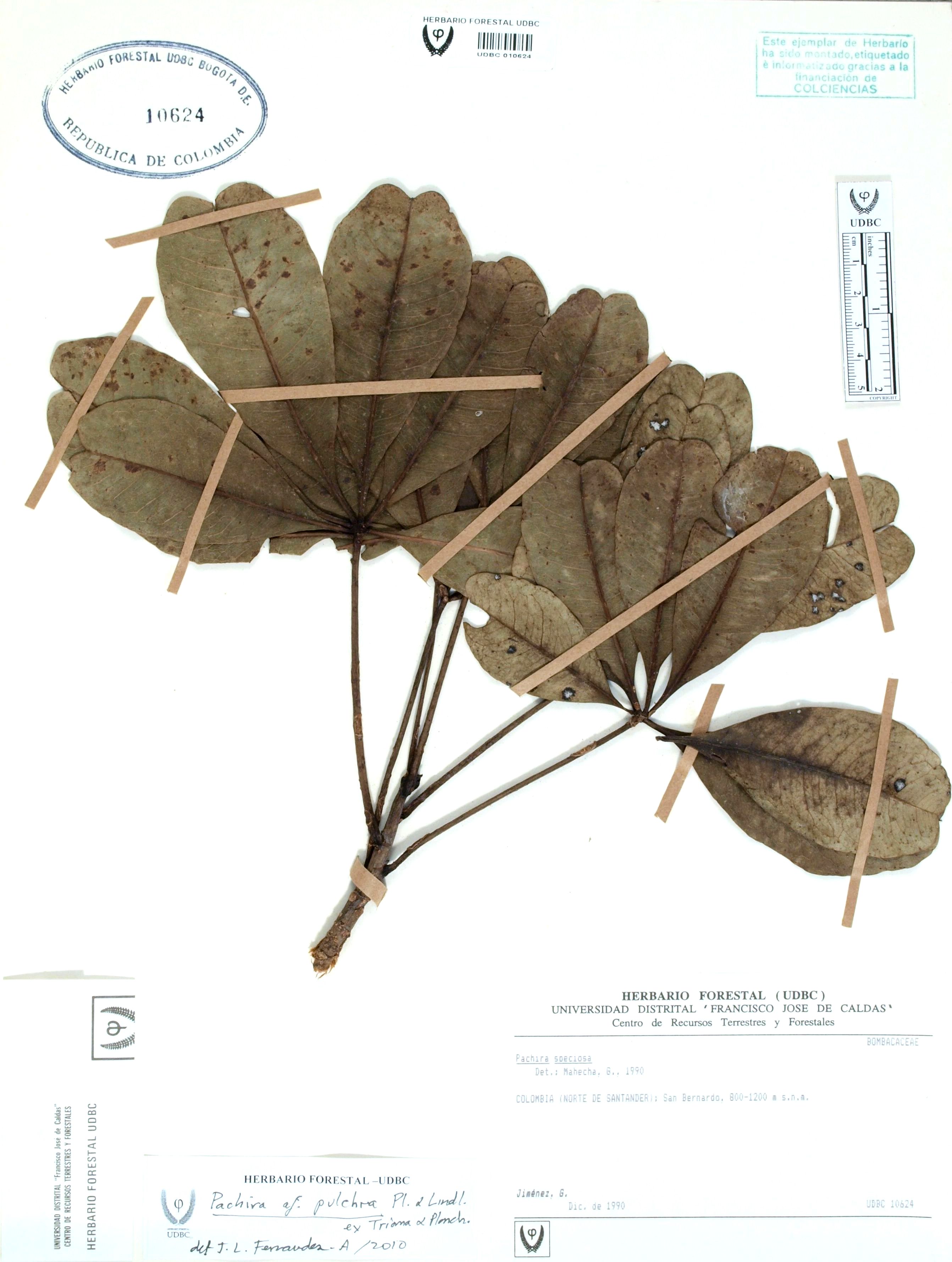 Fotografía del ejemplar Jiménez, G., determinado como Pachira pulchra en el año 2010