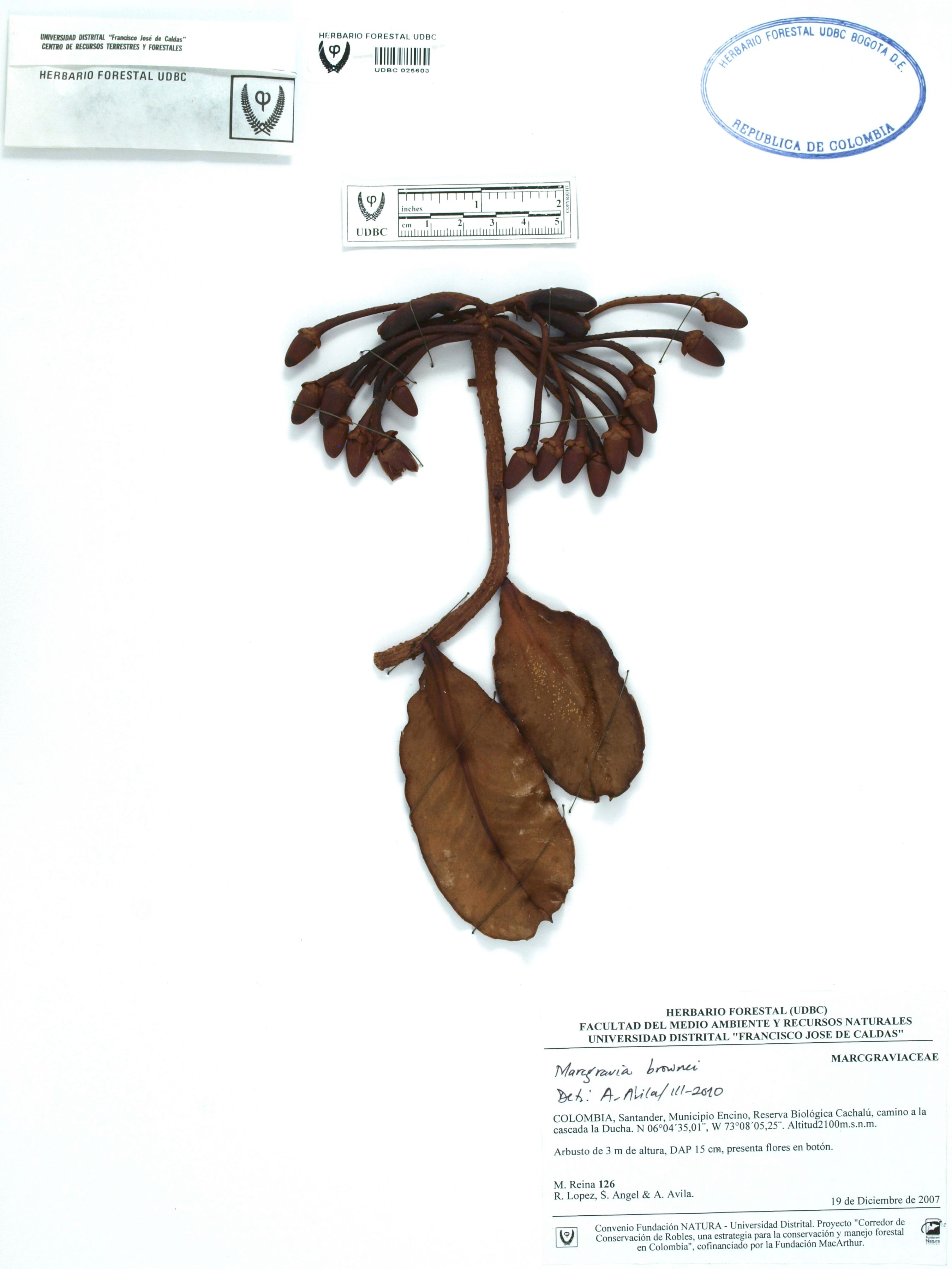 Fotografía del ejemplar Reina, M. 126, determinado como Marcgravia brownei en el año 2010