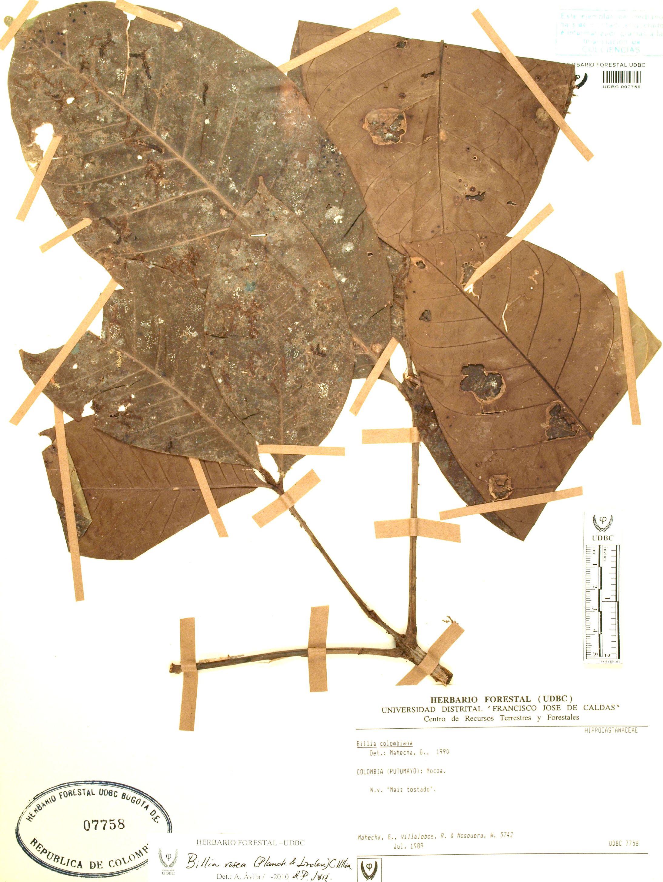 Fotografía del ejemplar Mahecha, G. 5742, determinado como Billia rosea en el año 2010