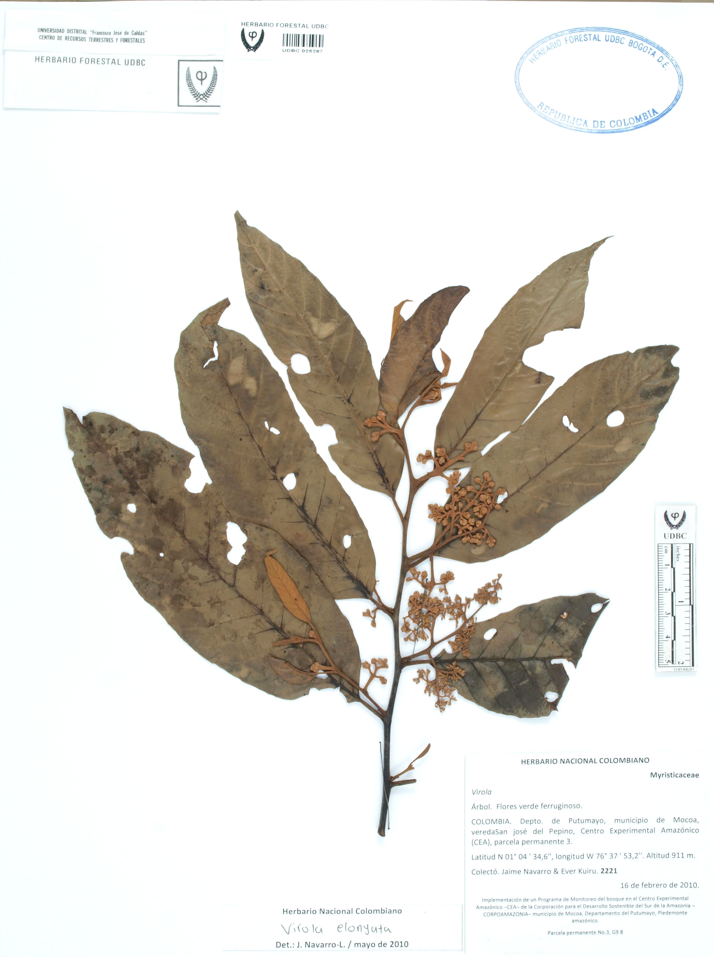 Fotografía del ejemplar Navarro, J. 2221, determinado como Virola elongata en el año 2010