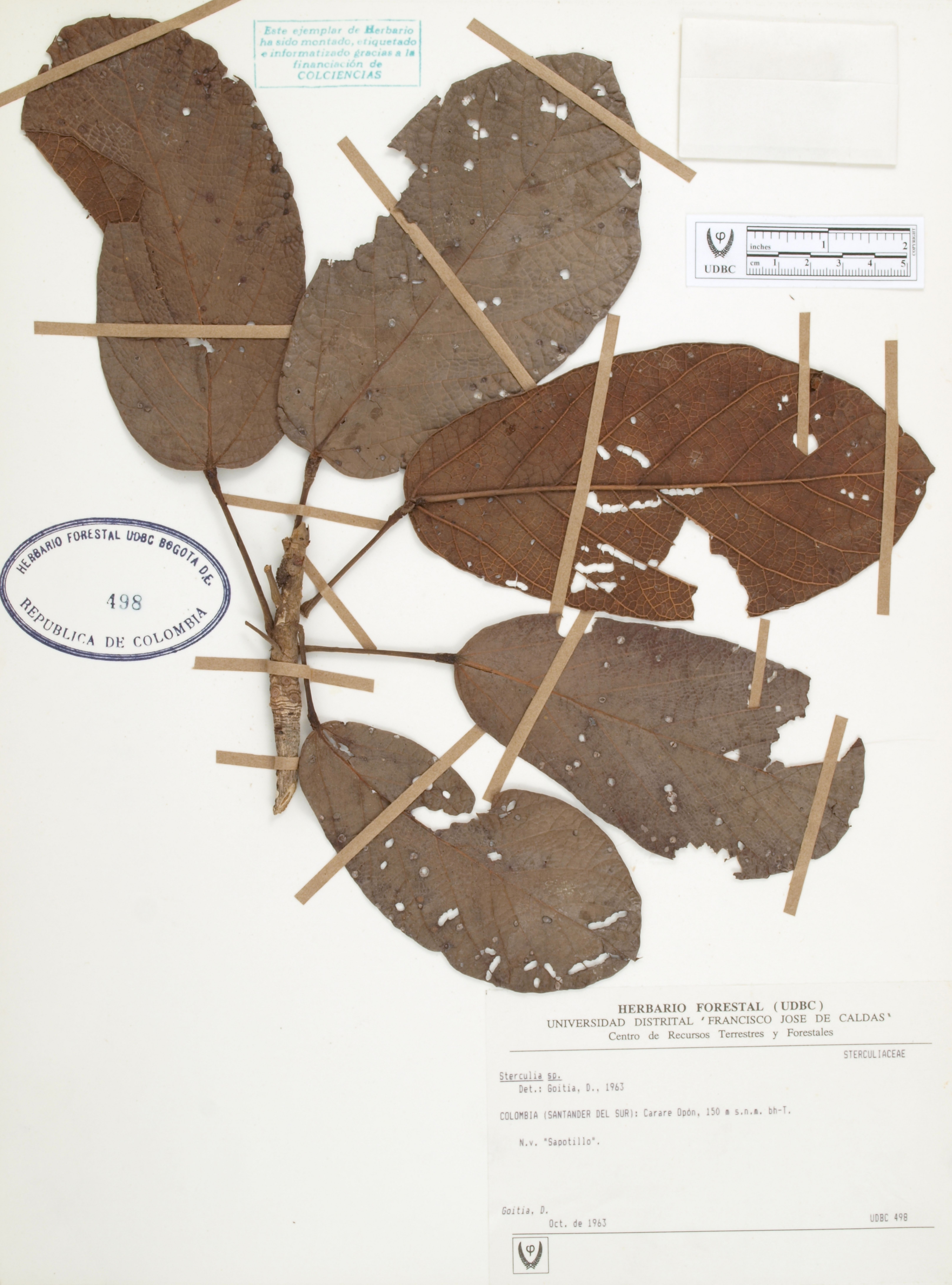 Fotografía del ejemplar Goitia, D., determinado como Sterculia sp. en el año 1963