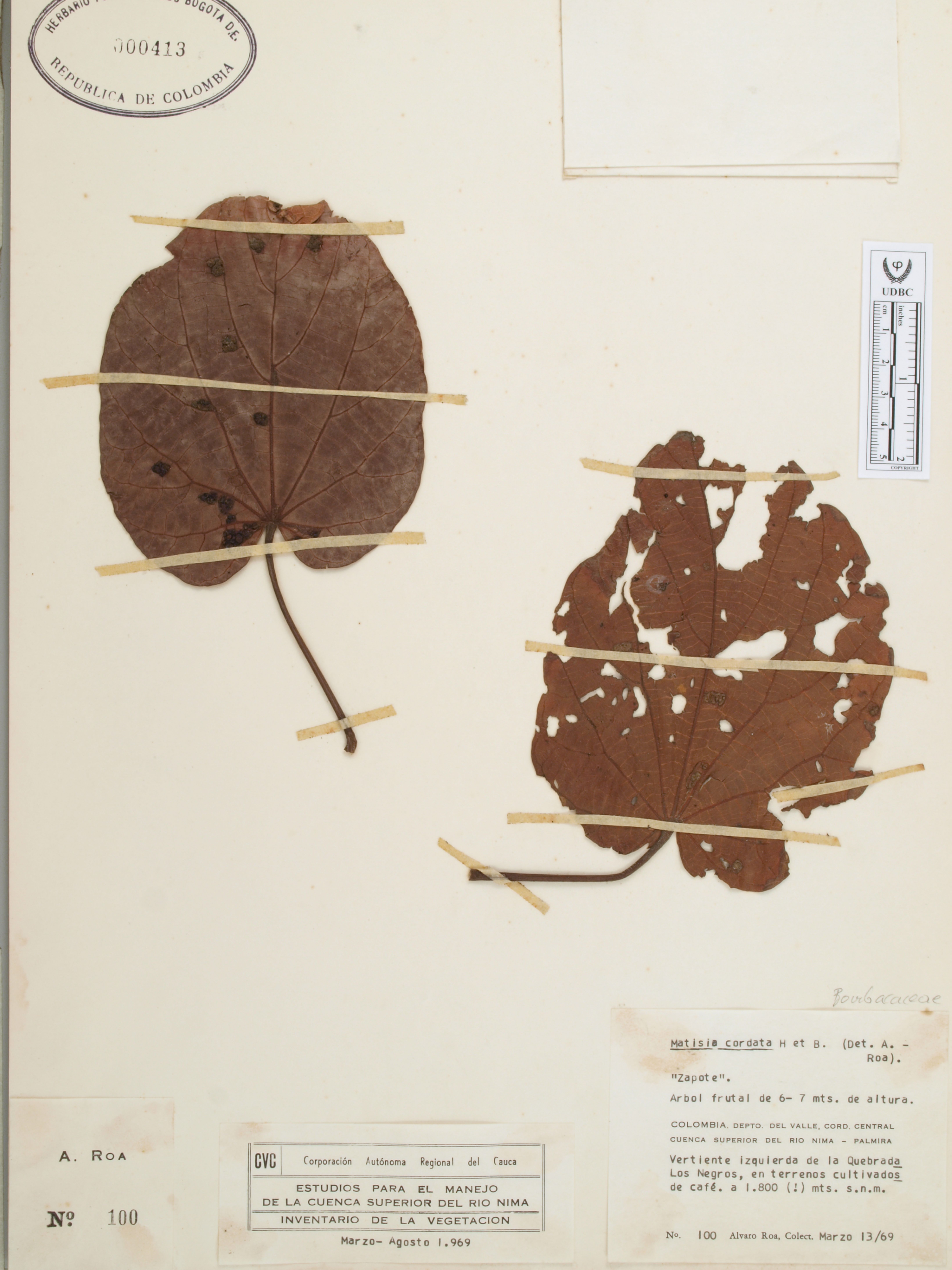Fotografía del ejemplar Roa, A. 100, determinado como Matisia cordata en el año 1969