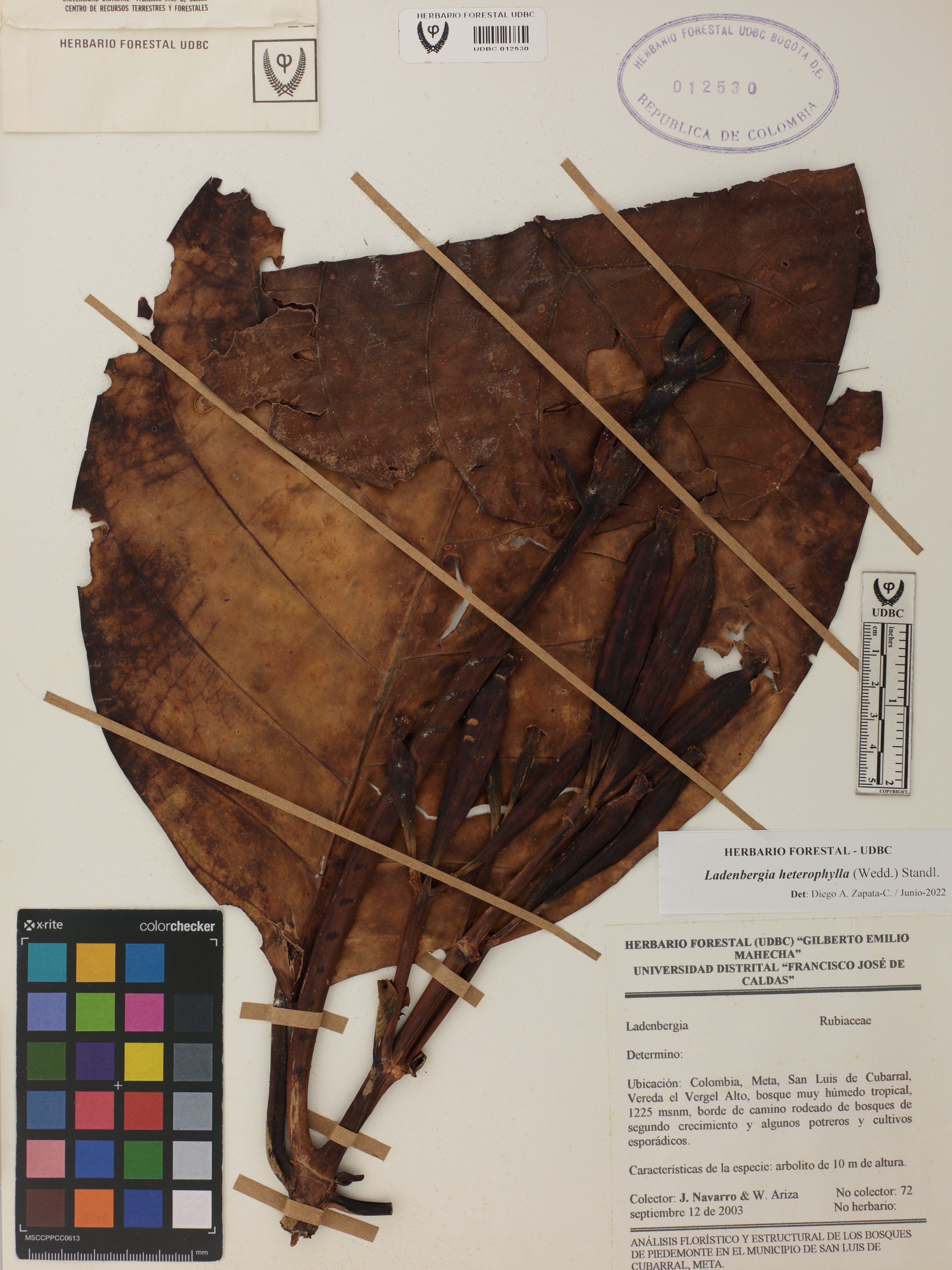 Fotografía del ejemplar Navarro, J. 72, determinado como Ladenbergia heterophylla en el año 2022