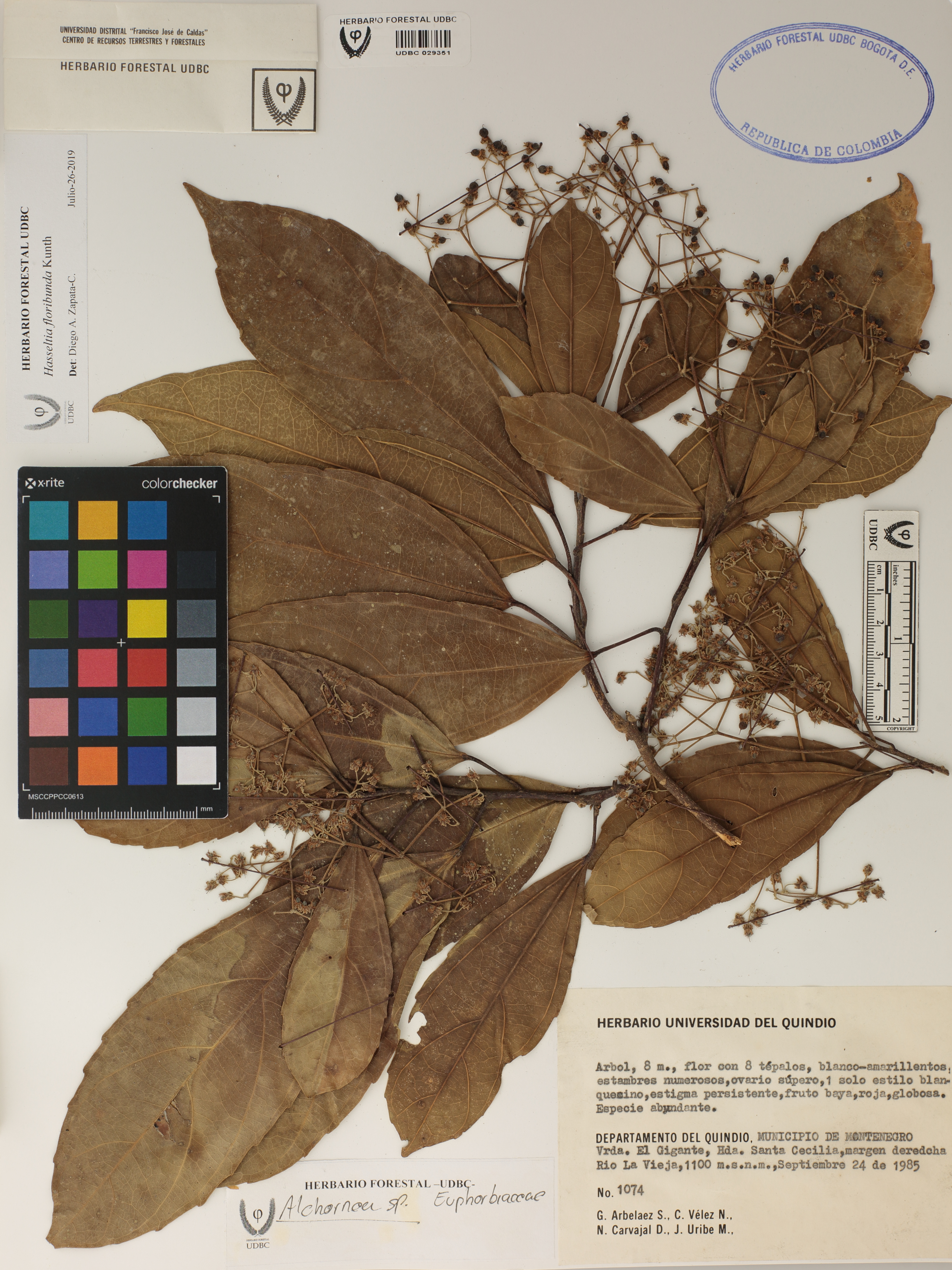 Fotografía del ejemplar Arbeláez, G. 1074, determinado como Hasseltia floribunda en el año 2019