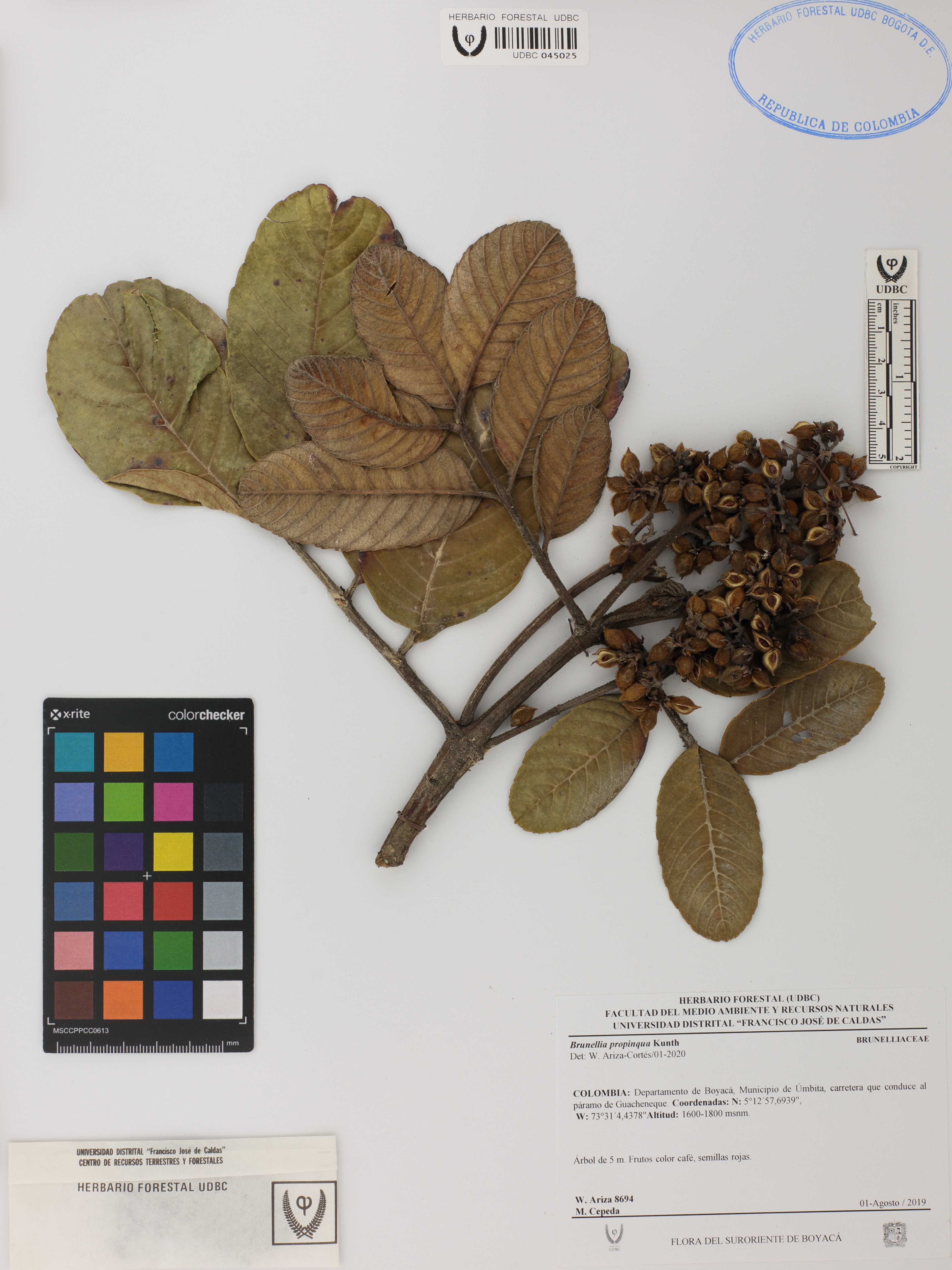 Fotografía del ejemplar Ariza, W. 8694, determinado como Brunellia propinqua en el año 2020