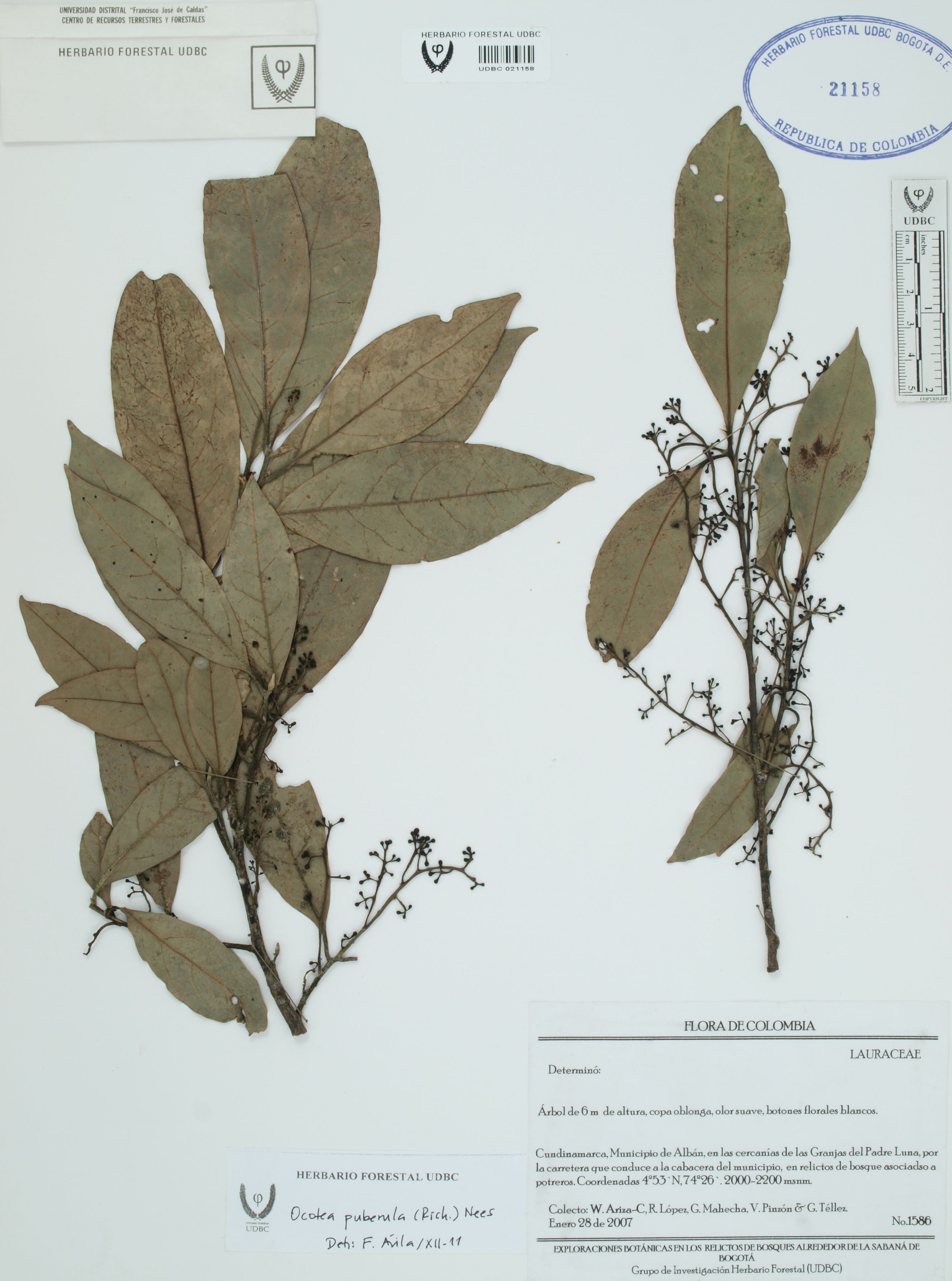 Fotografía del ejemplar Ariza-C., W. 1586, determinado como Ocotea puberula en el año 2011