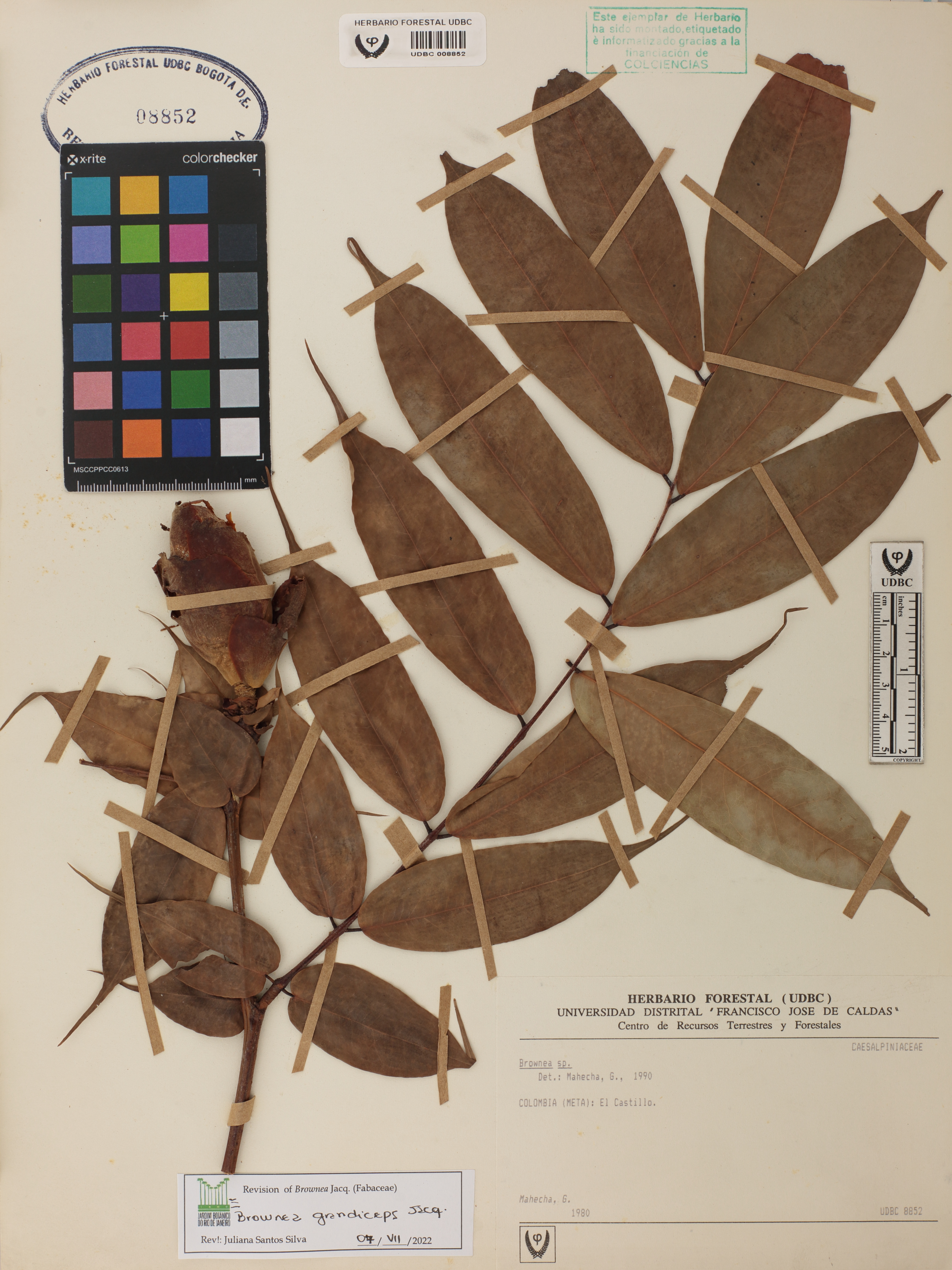 Fotografía del ejemplar Mahecha, G., determinado como Brownea grandiceps en el año 2022