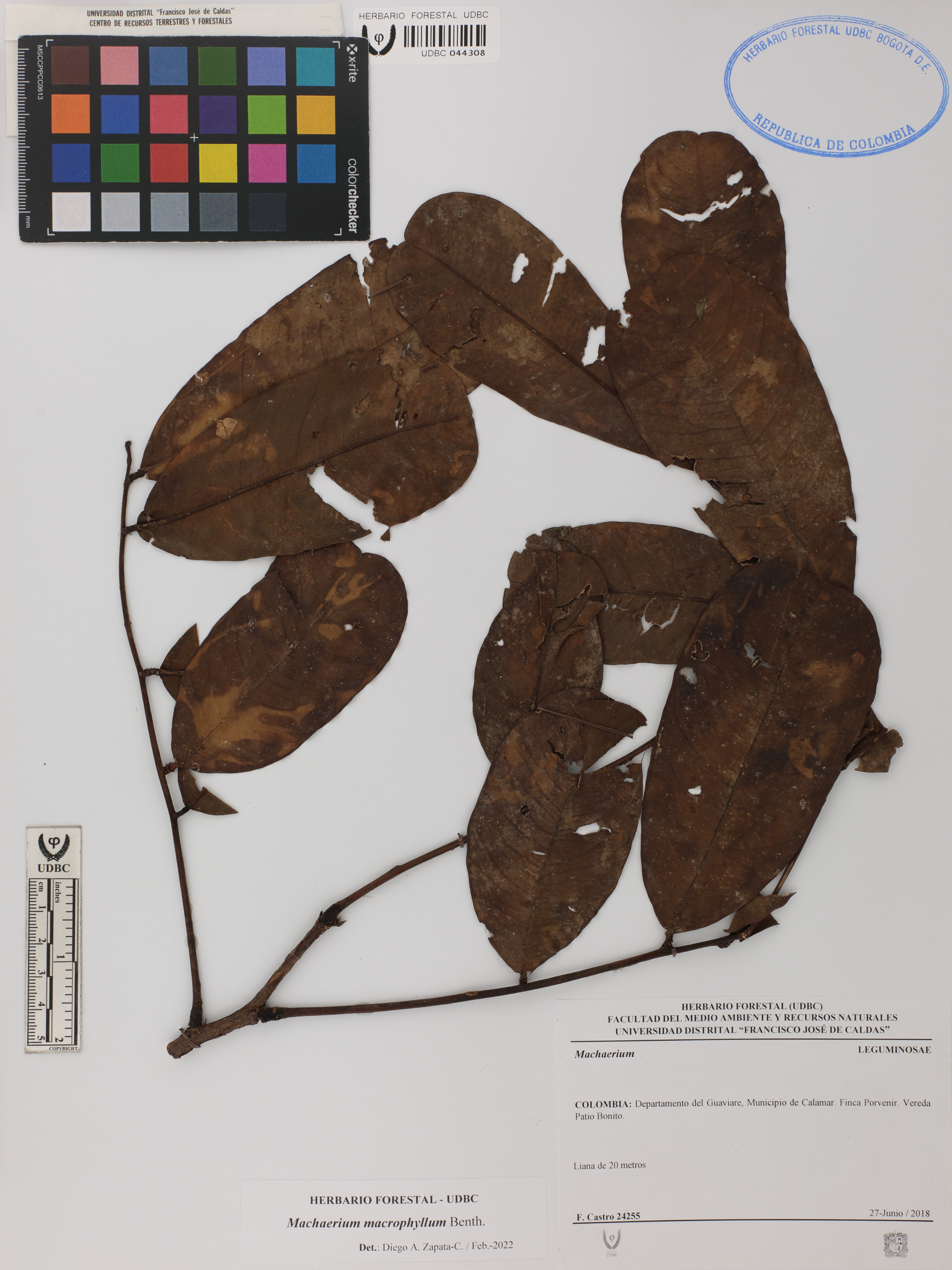 Fotografía del ejemplar Castro, F. 24255, determinado como Machaerium macrophyllum en el año 2022