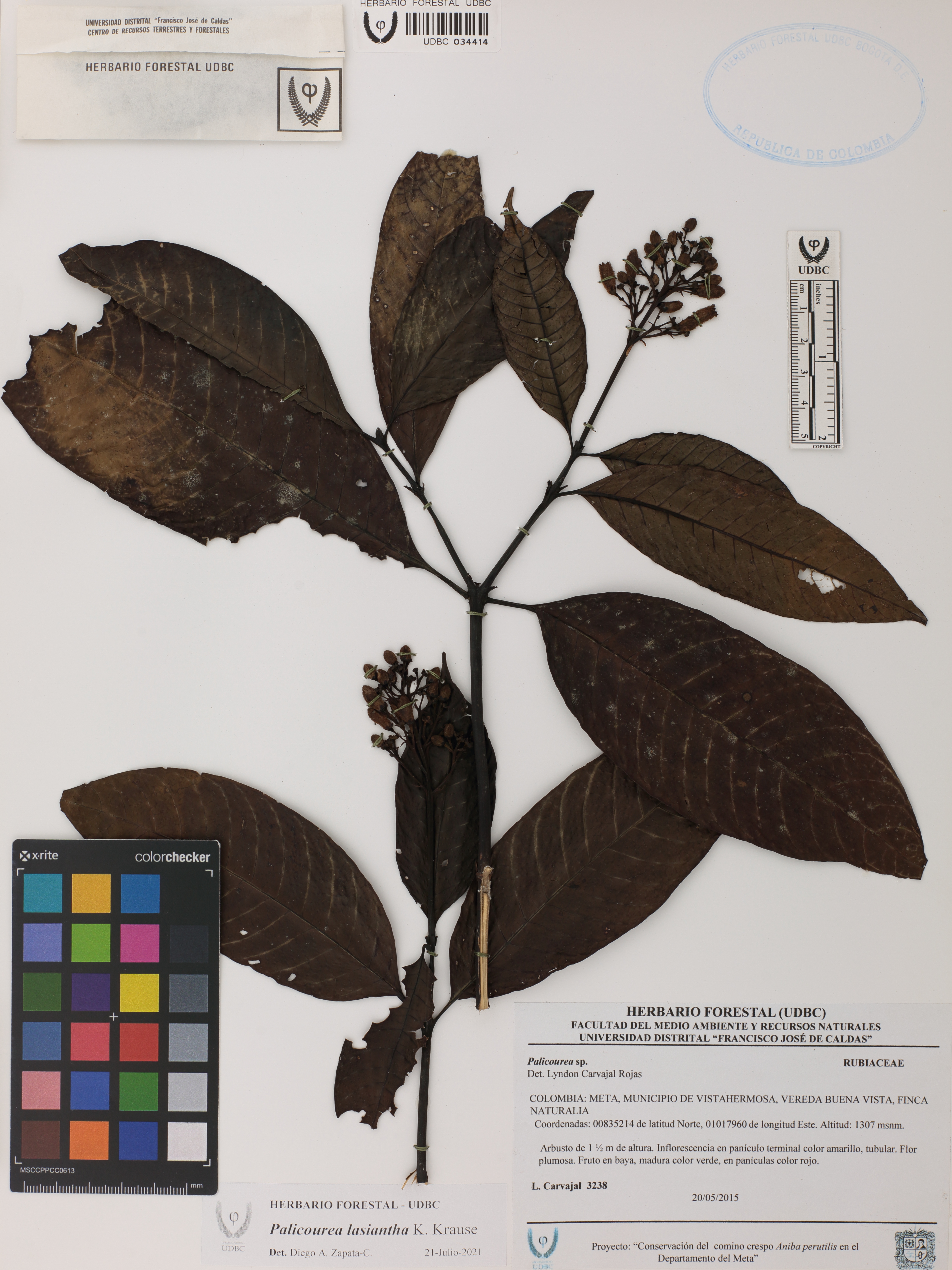 Fotografía del ejemplar Carvajal, L. 3238, determinado como Palicourea lasiantha en el año 2021