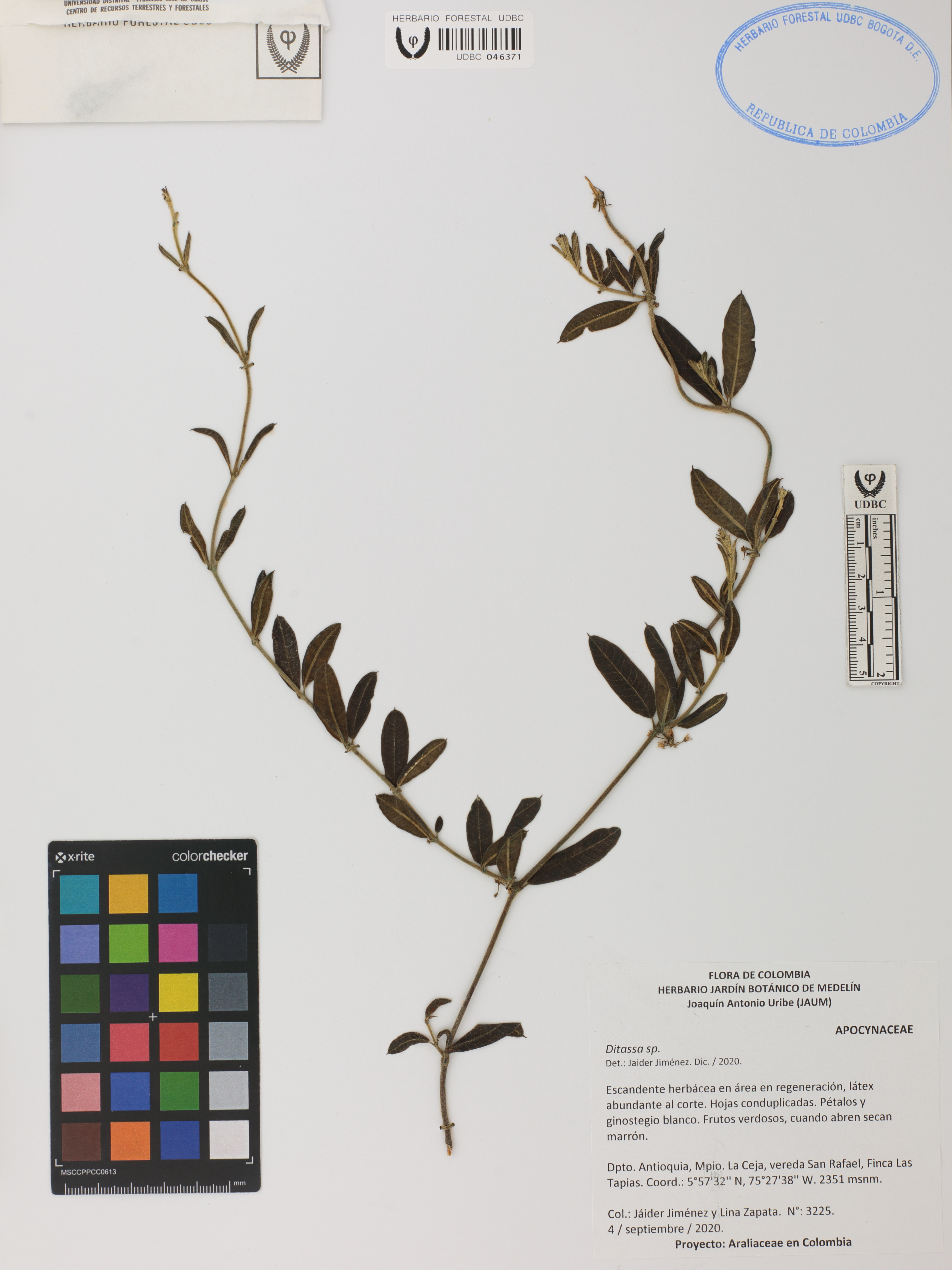 Fotografía del ejemplar Jiménez, J. 3225, determinado como Ditassa sp. en el año 2020