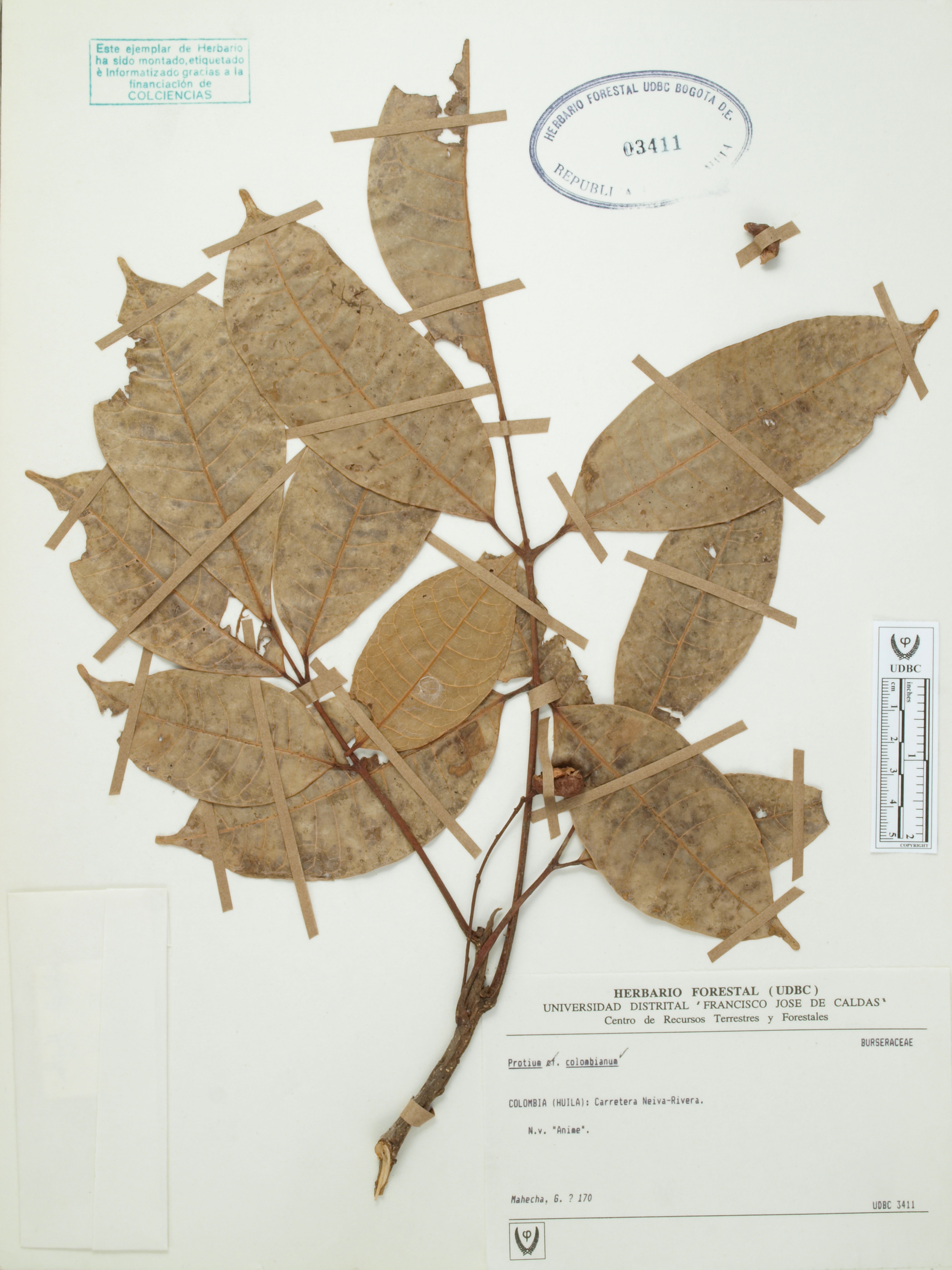 Fotografía del ejemplar Mahecha, G. 170, determinado como Protium colombianum en el año 2005