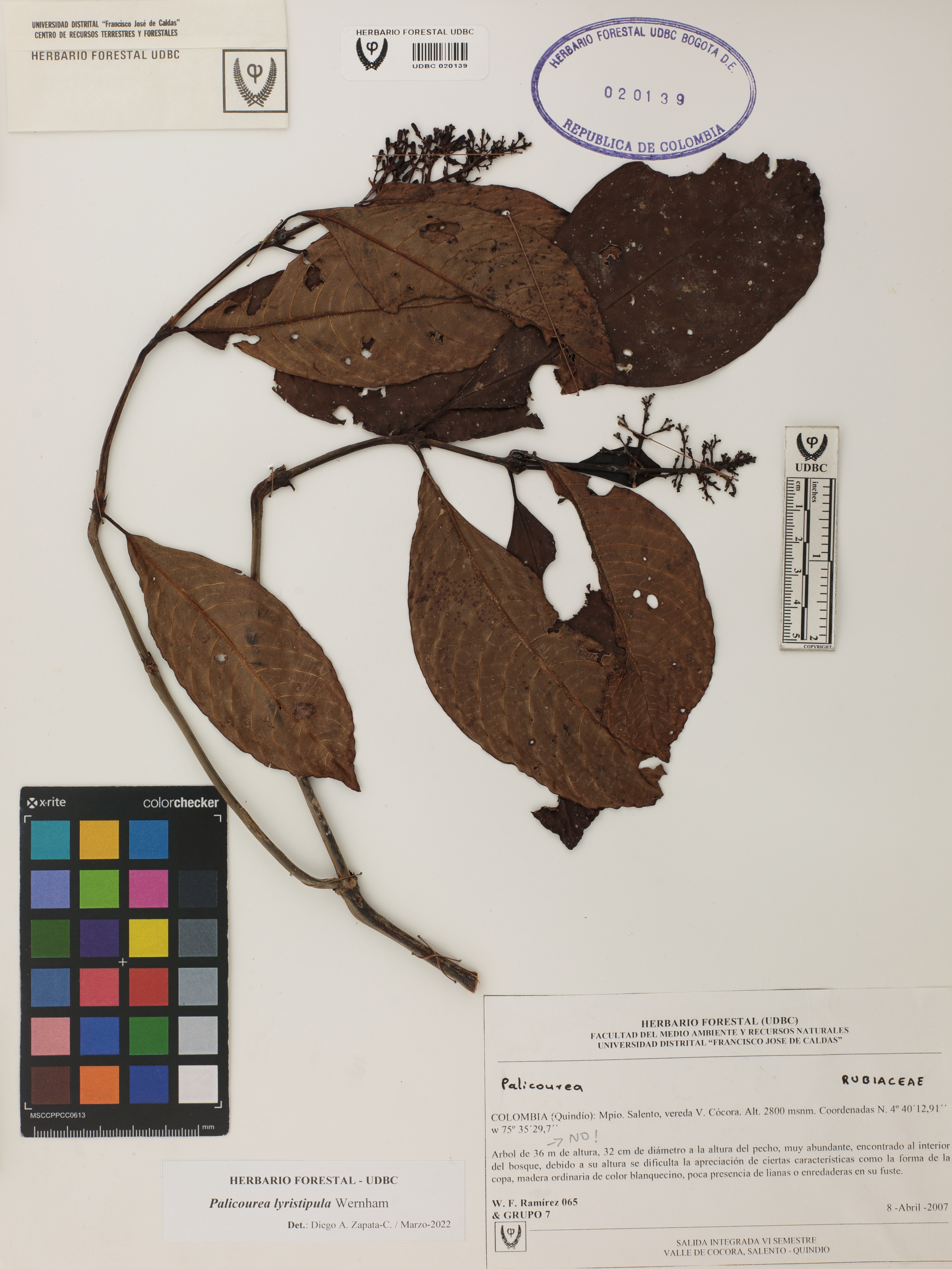 Fotografía del ejemplar Ramírez, W. 65, determinado como Palicourea lyristipula en el año 2022