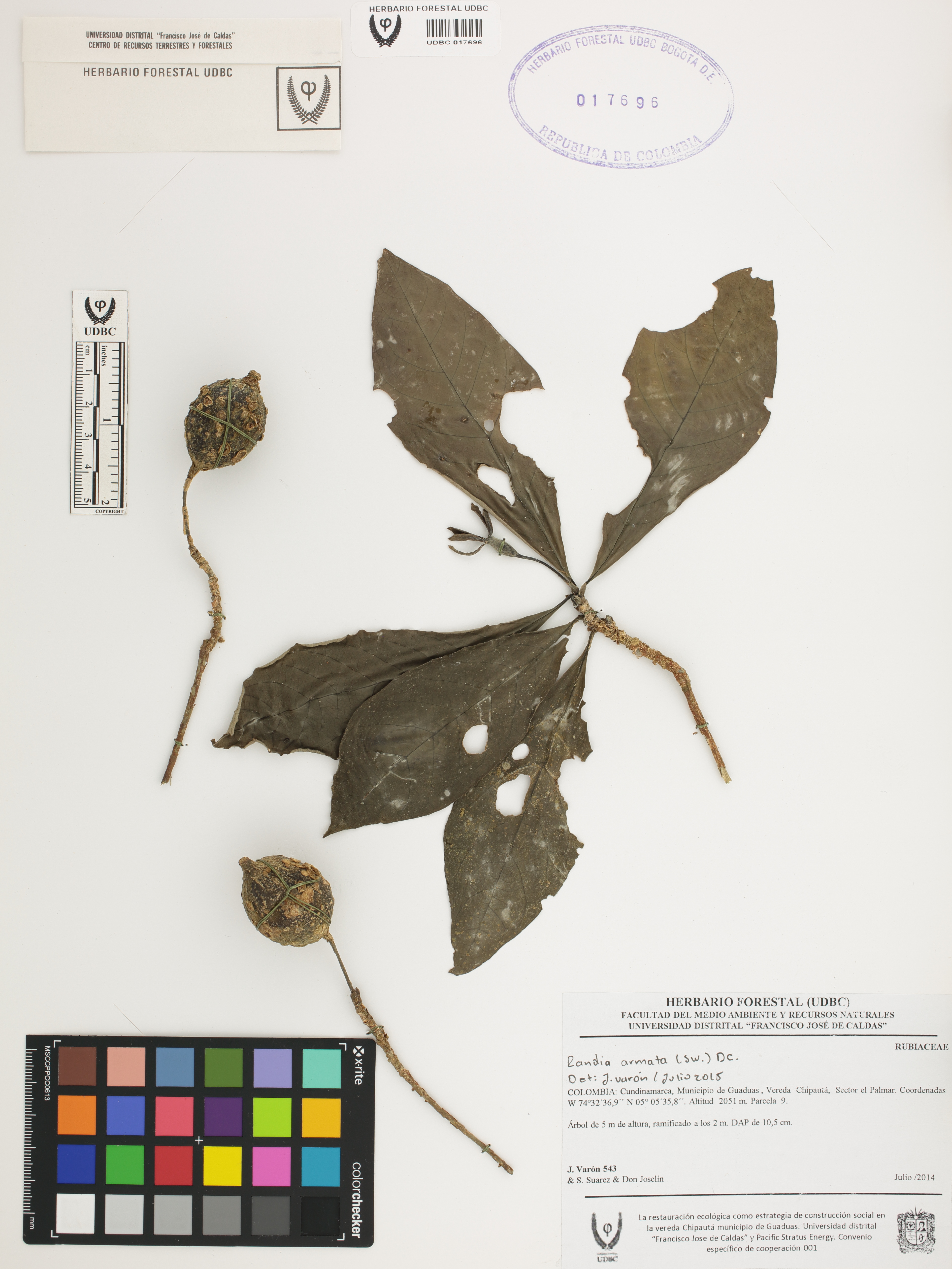 Fotografía del ejemplar Varón, J. 543, determinado como Randia armata en el año 2015