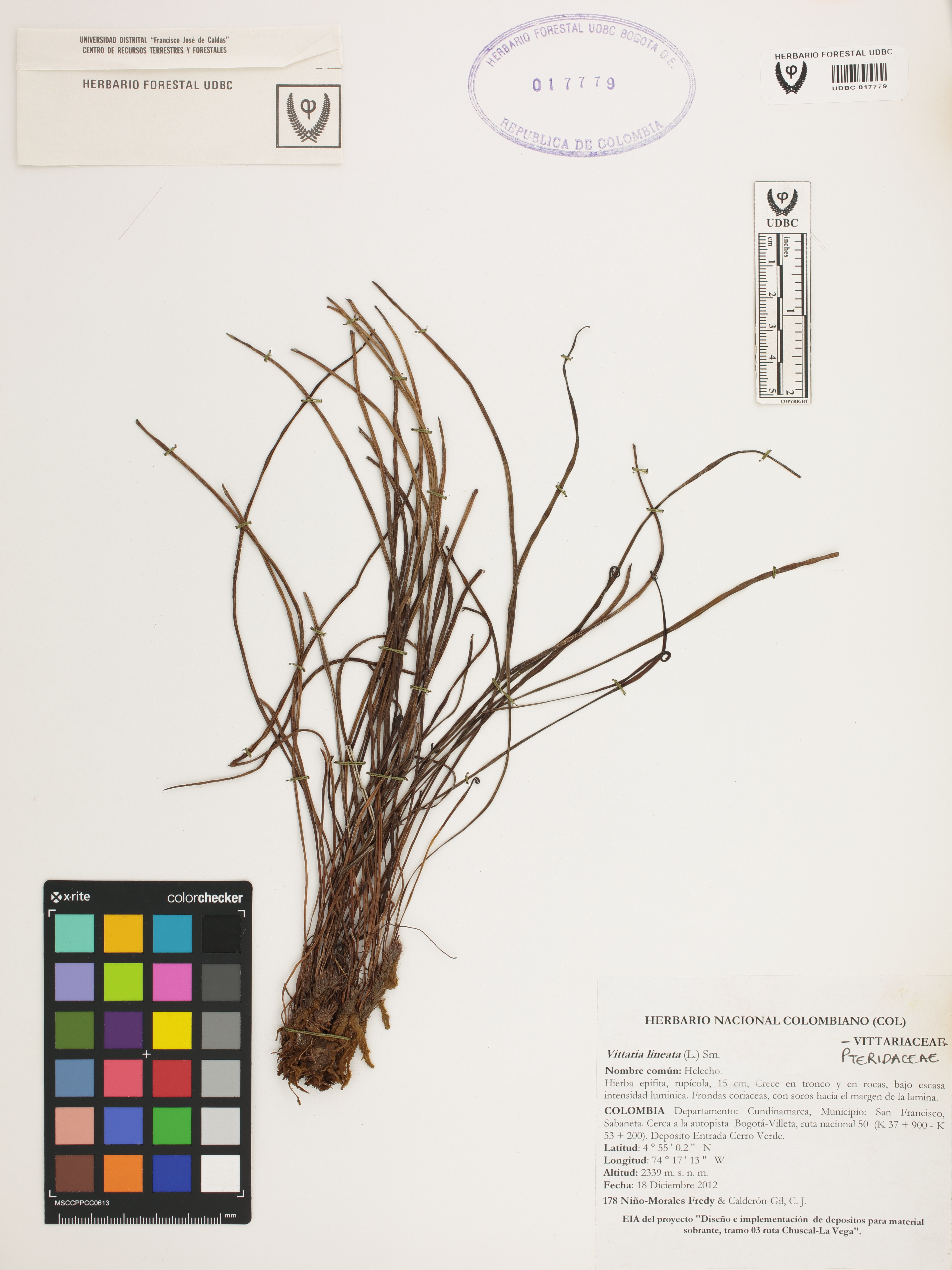 Fotografía del ejemplar Niño-Morales, F. 178, determinado como Vittaria lineata